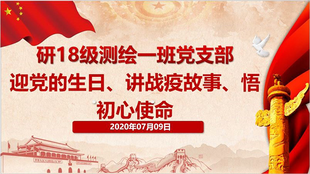 为贯彻落实党中央关于常态化疫情防控的决策部署,充分发挥基层党组织战斗堡垒作用和师生党员先锋模范作用,让党旗始终高高飘扬在疫情防控、返校复学、事业发展全过程全方位,并结合中国共产党99周年华诞之际。2020年7月9日19:30,BEATS研18级测绘一班党支部在腾讯会议平台上开展主题教育活动,活动主题为“迎党的生日,讲战疫故事、悟初心使命”,活动由支部的谭鑫、项凡、李奇芪三位同志主讲。