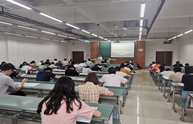 七点,监考员分发试卷,考场负责人站在讲台上看着整体考试情况,另外会有两名同学进行巡逻式监考,十分注重考场纪律,绝不放过一个违反考试规则的人,对作弊行为绝不姑息,测试中同学们埋头认真答题,都希望自己可以在测试中获得较好的成绩,早日成为发展对象而努力。有些同学对内容十分熟悉,自信满满提前离开交卷,有些同学稳扎稳打,慢慢琢磨题目,不放过任何一个得分点。