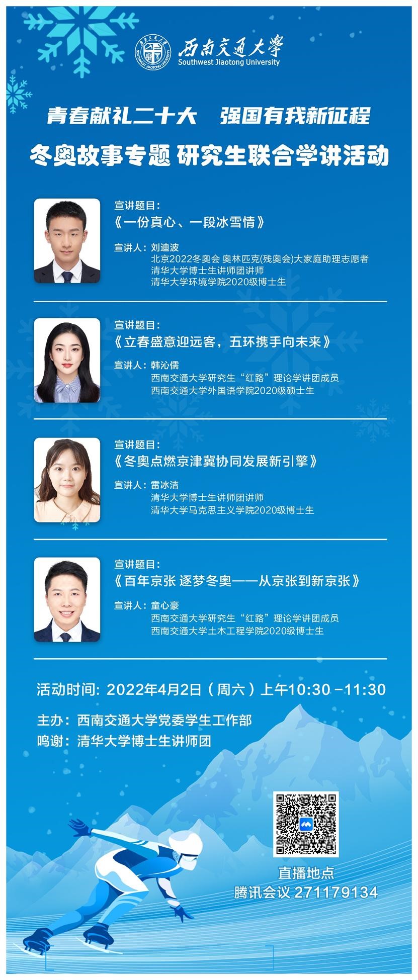 为深入学习宣传贯彻习近平新时代中国特色社会主义思想和建设体育强国的重要论述精神,讲好冬奥故事,公司拟邀请清华大学博士生讲师团联合开展“青春献礼二十大,强国有我新征程”——冬奥故事专题宣讲活动,现就活动有关事项通知如下: