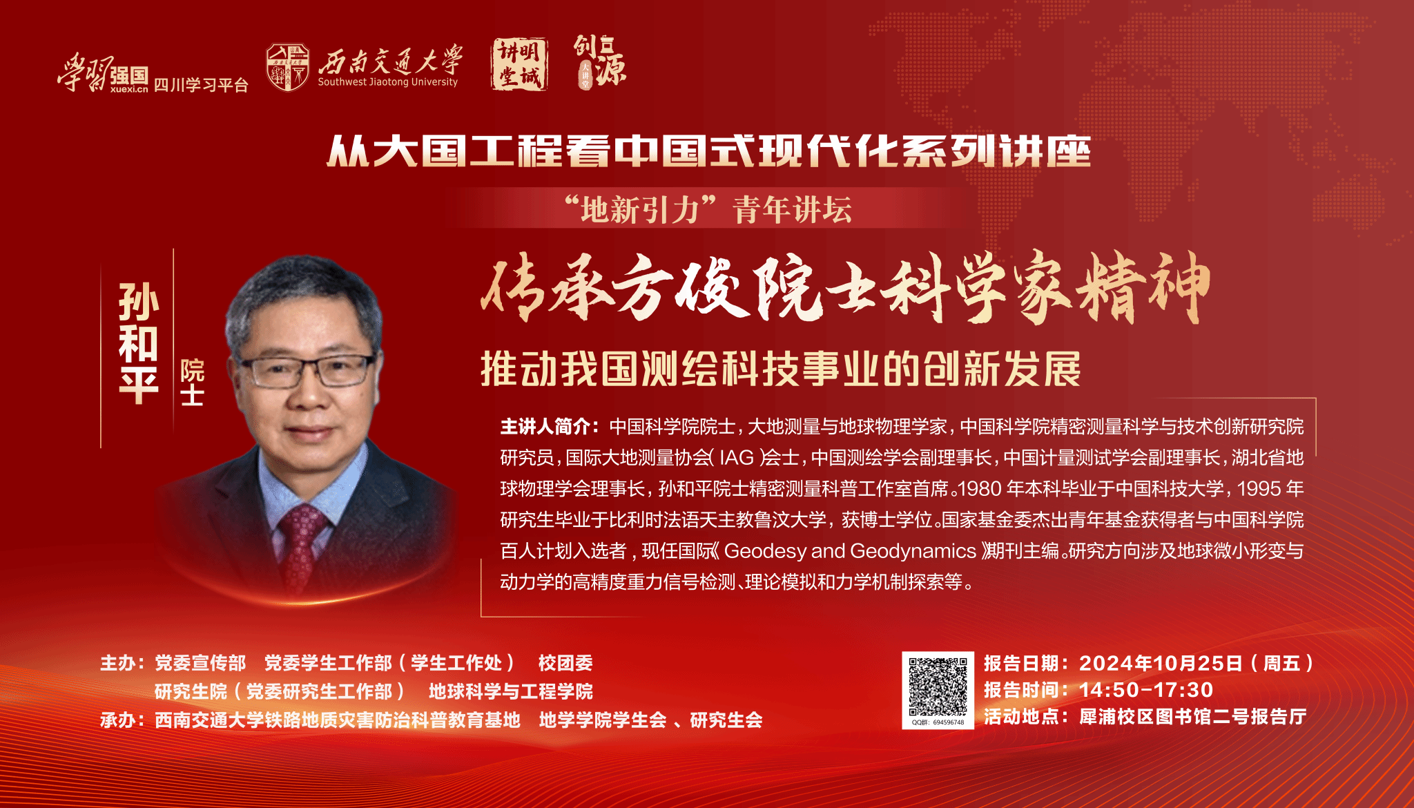 为缅怀方俊院士的卓越贡献和弘扬其科学家精神为核心,深情回顾方俊院士在中国大地测量与重力学研究中的杰出成就。呼吁新时代的学子们努力拼搏,为我国科技事业贡献力量,实现科技自立自强。本期“地新引力”青年讲坛——“从大国工程看中国式现代化”之弘扬方俊院士科学家精神专题讲座将于2024年10月25日举行,现就相关通知如下: