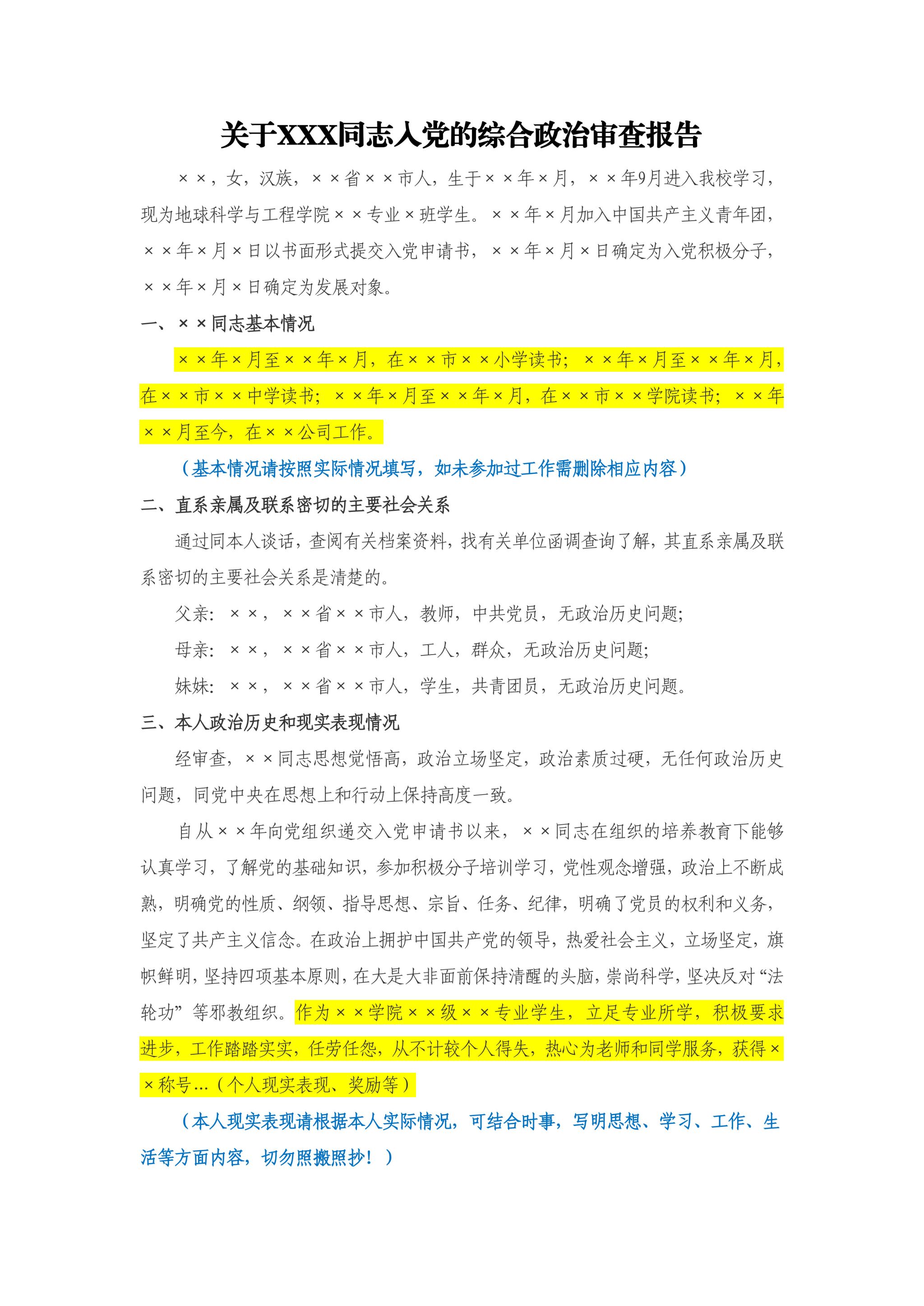 关于XXX同志入党的综合政治审查报告撰写指南及模板