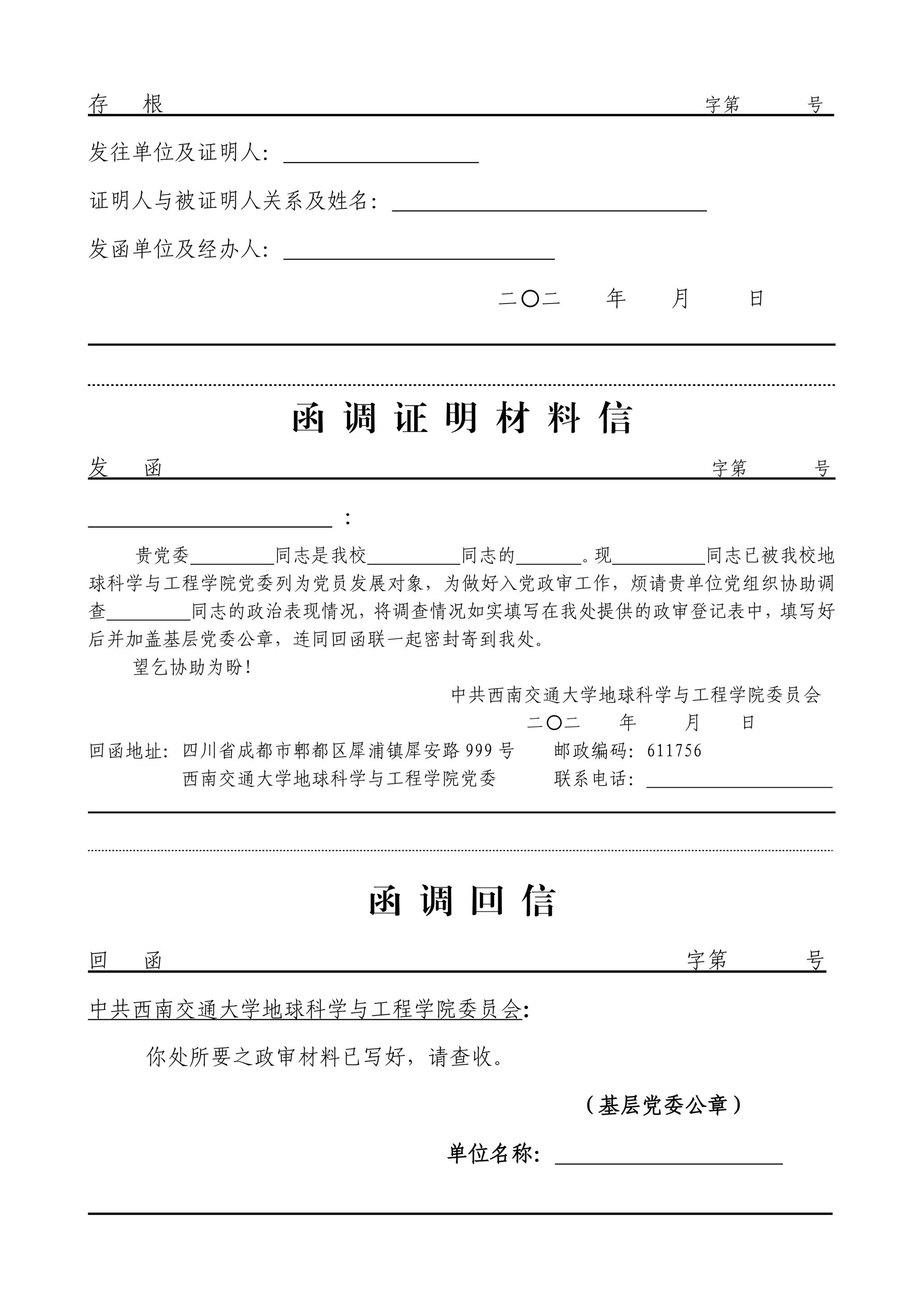 1.《函调证明材料信》一式三联,前面两联由党支部填写,填写好后由支部书记保留第一联,需要寄给亲属的为函调证明材料信第二、三联以及政审登记表,父母双方一人一份(父母某方有去世的话就不需要函调)。