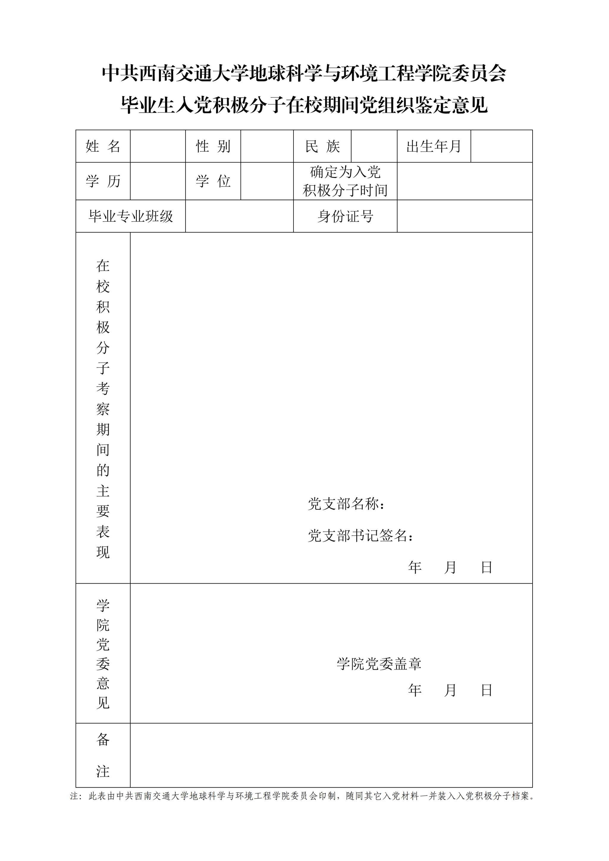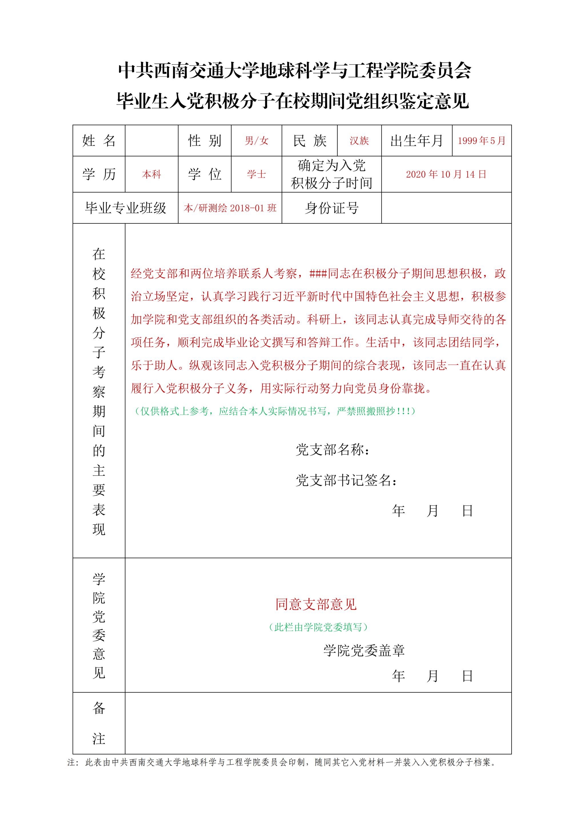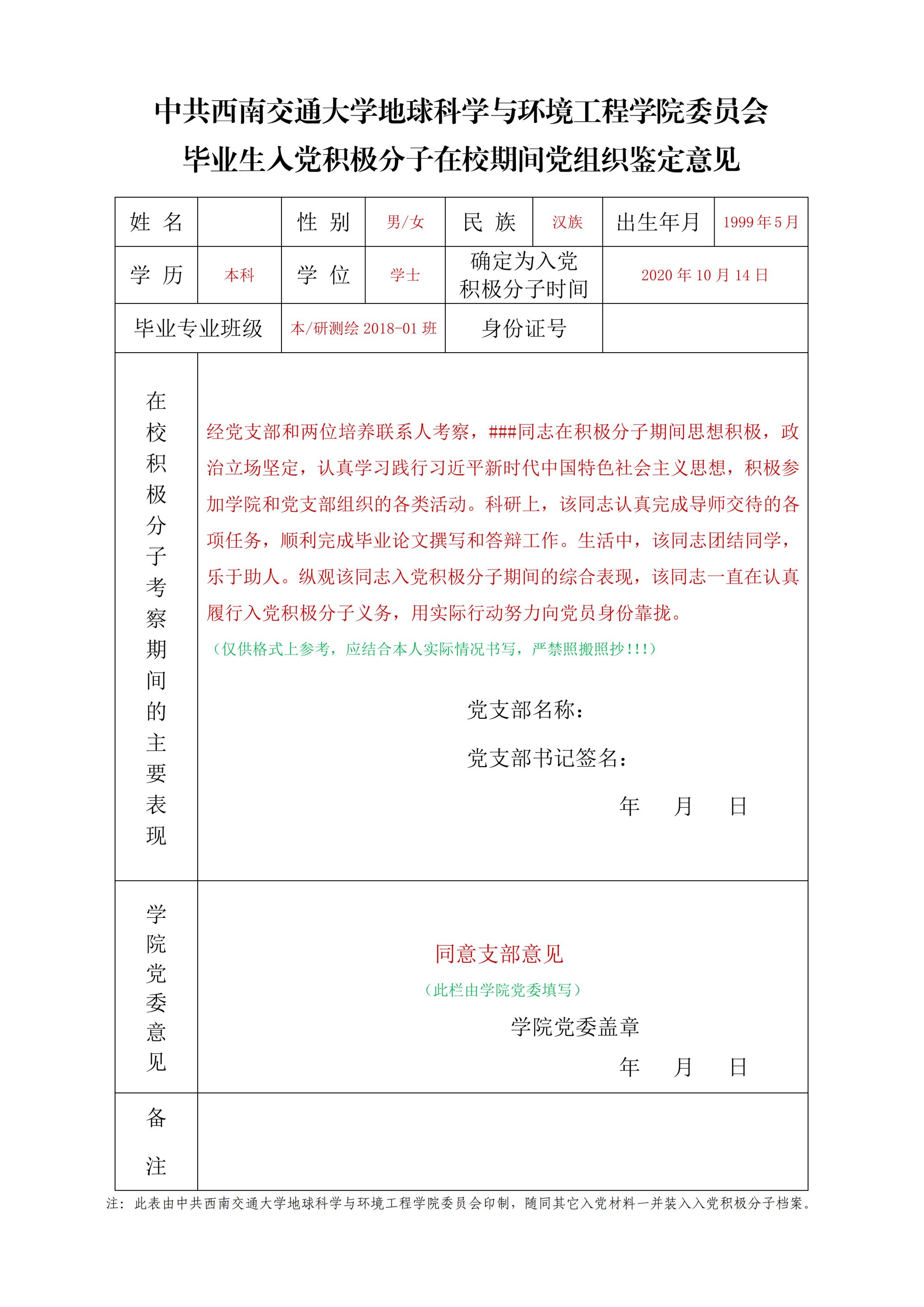 【地环版本】毕业生入党积极分子在校期间党组织鉴定意见样例与撰写指南: