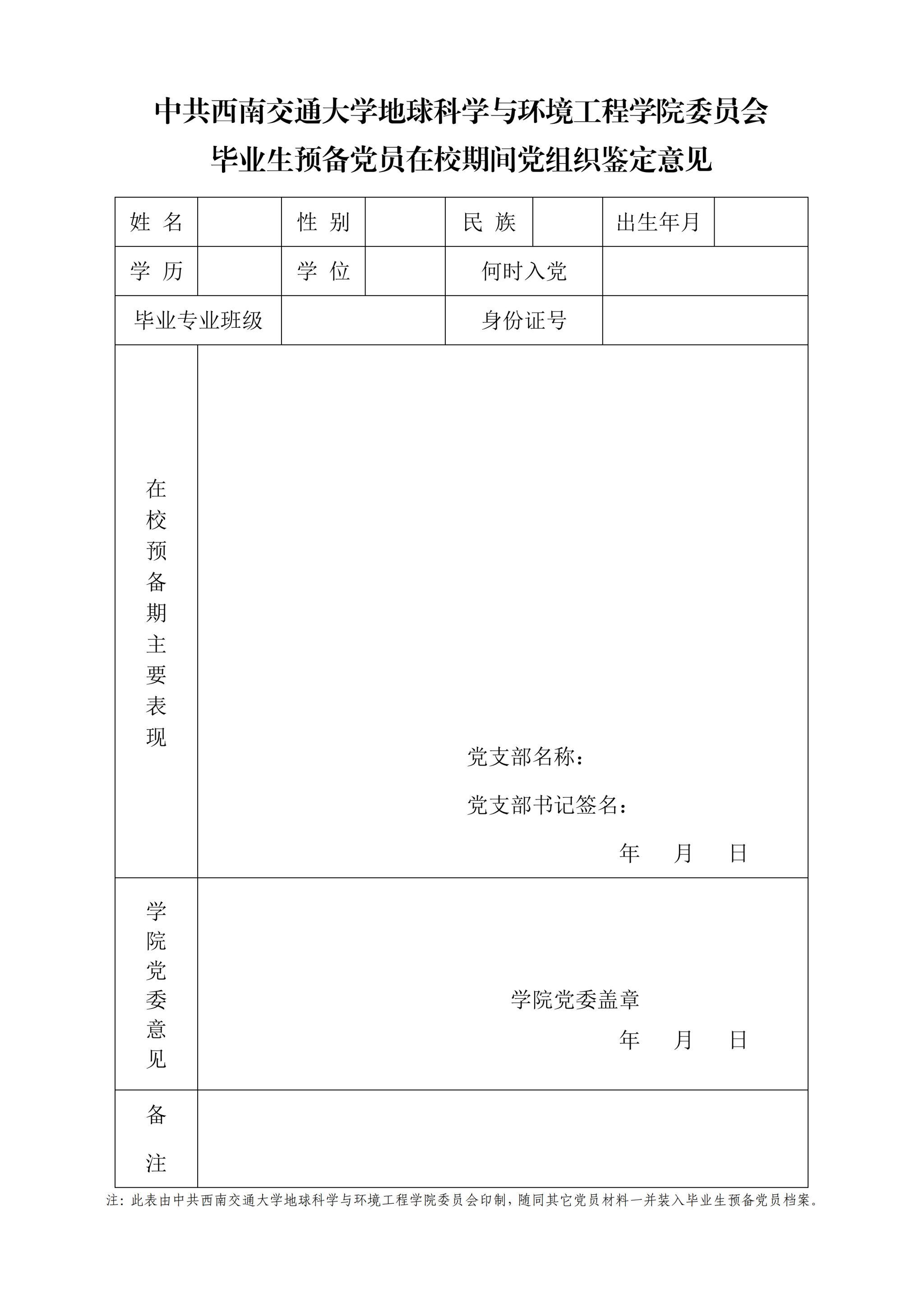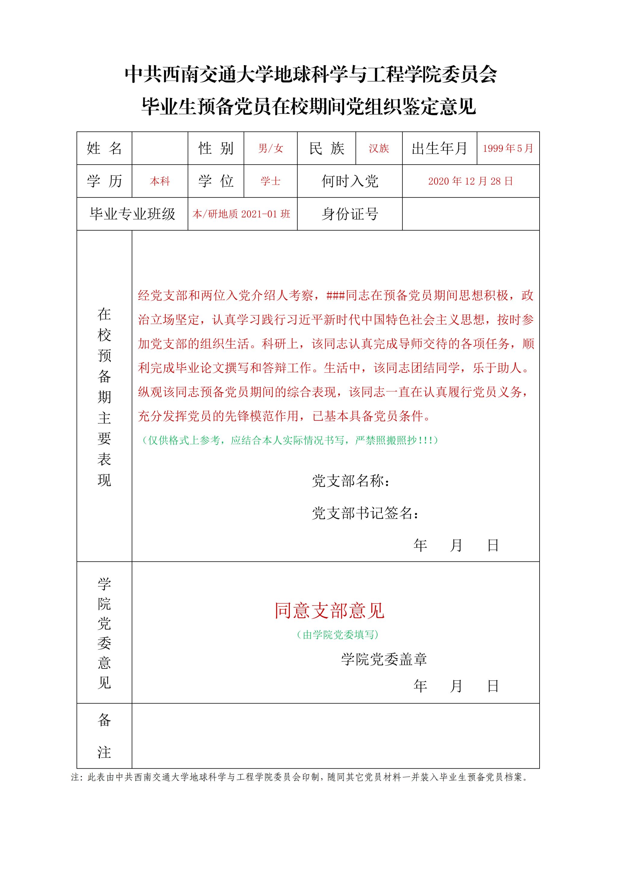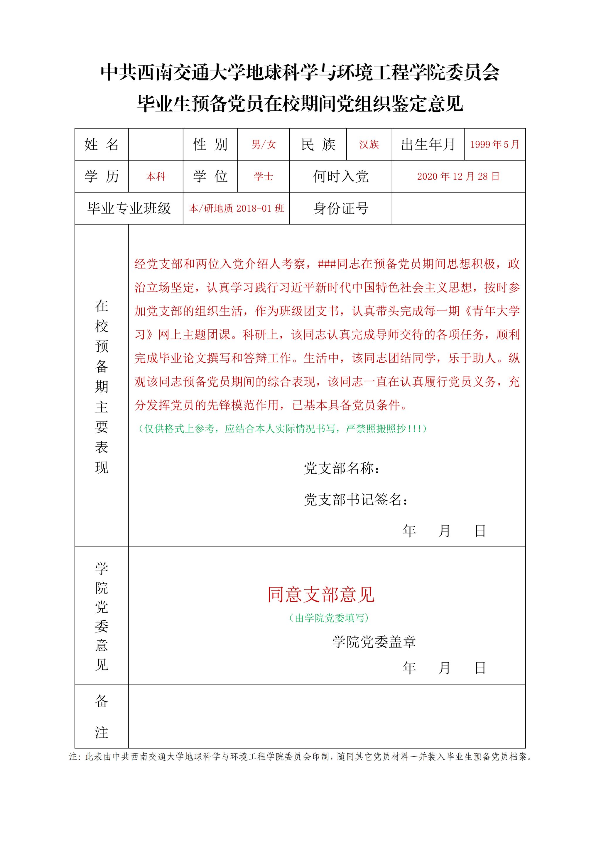 【地环版本】毕业生预备党员在校期间党组织鉴定意见样例与撰写指南: