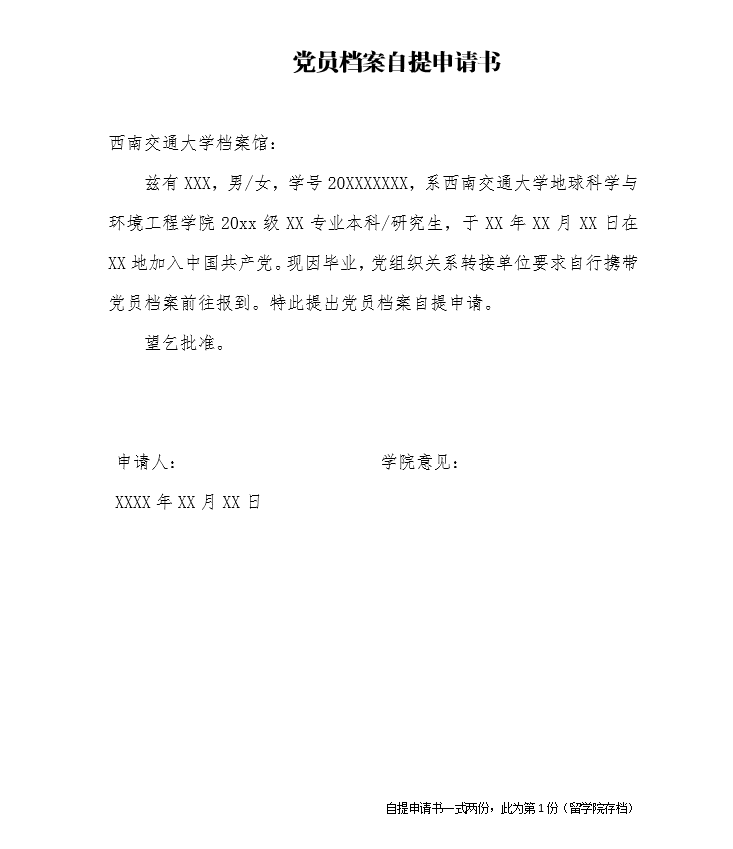 温馨提示:党员档案自提申请书一式两份,写好之后交至X4538办公室文强老师处。