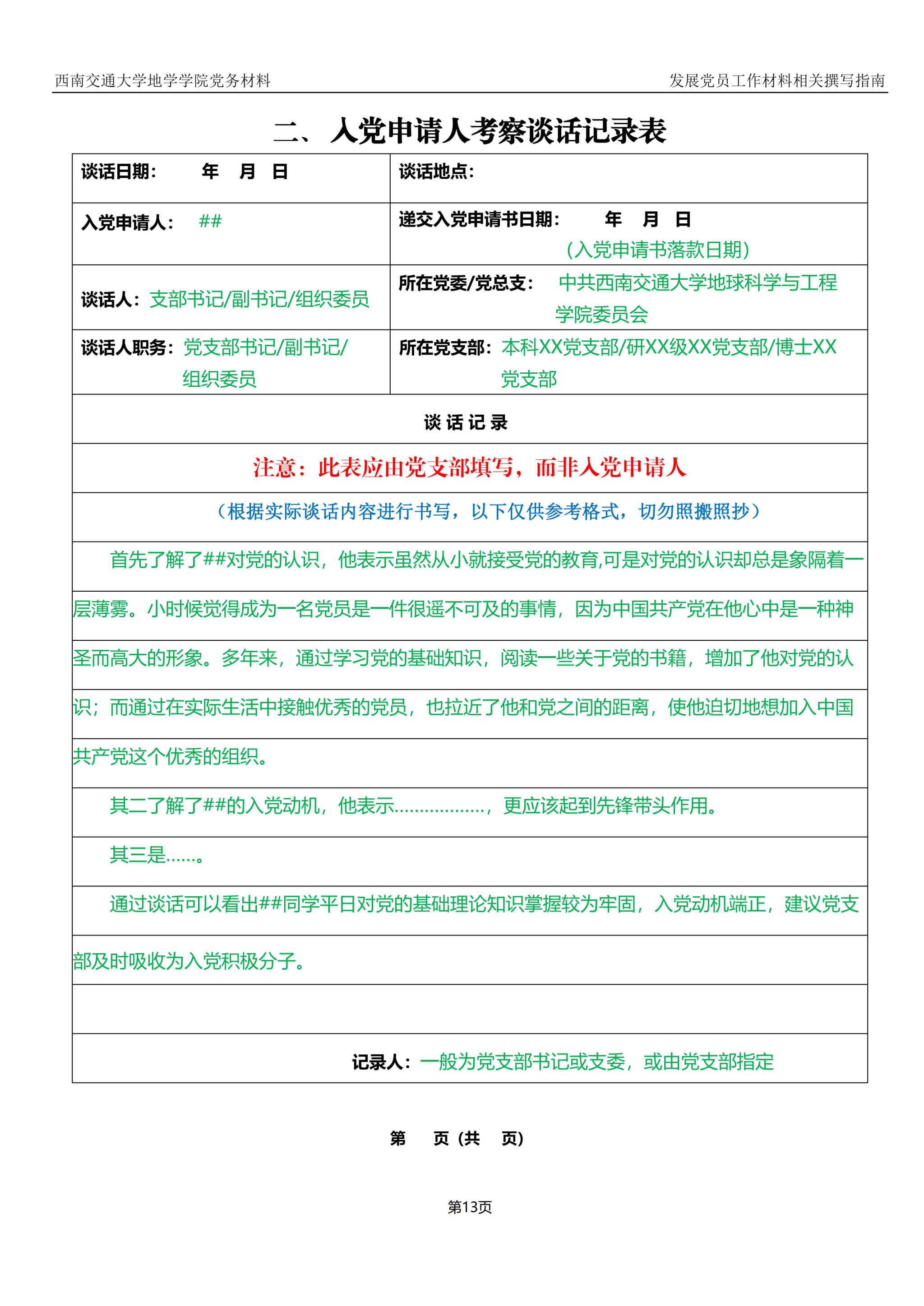 入党申请人考察谈话记录表样例及撰写指南