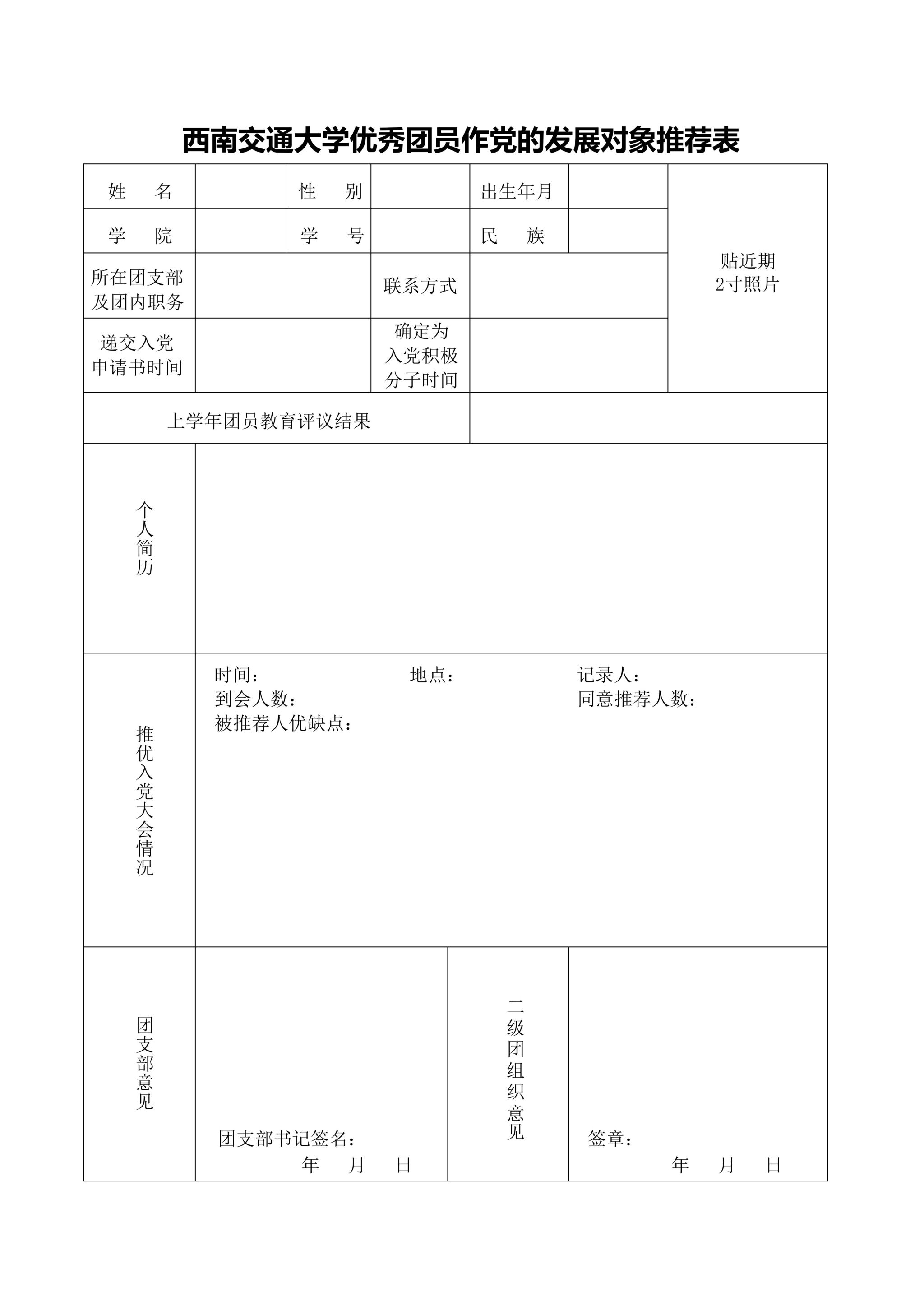 BEATS优秀团员作党的发展对象推荐表样例