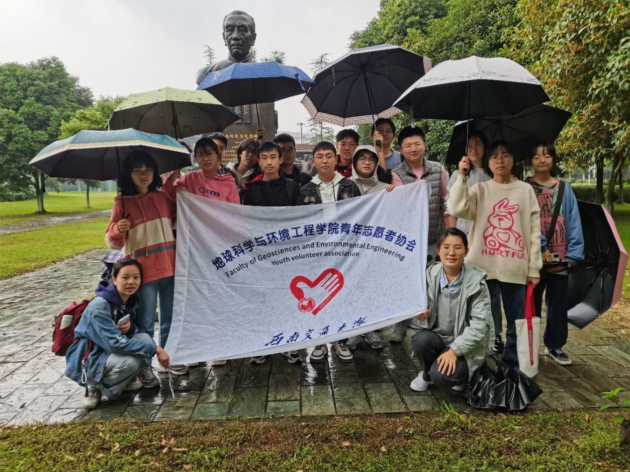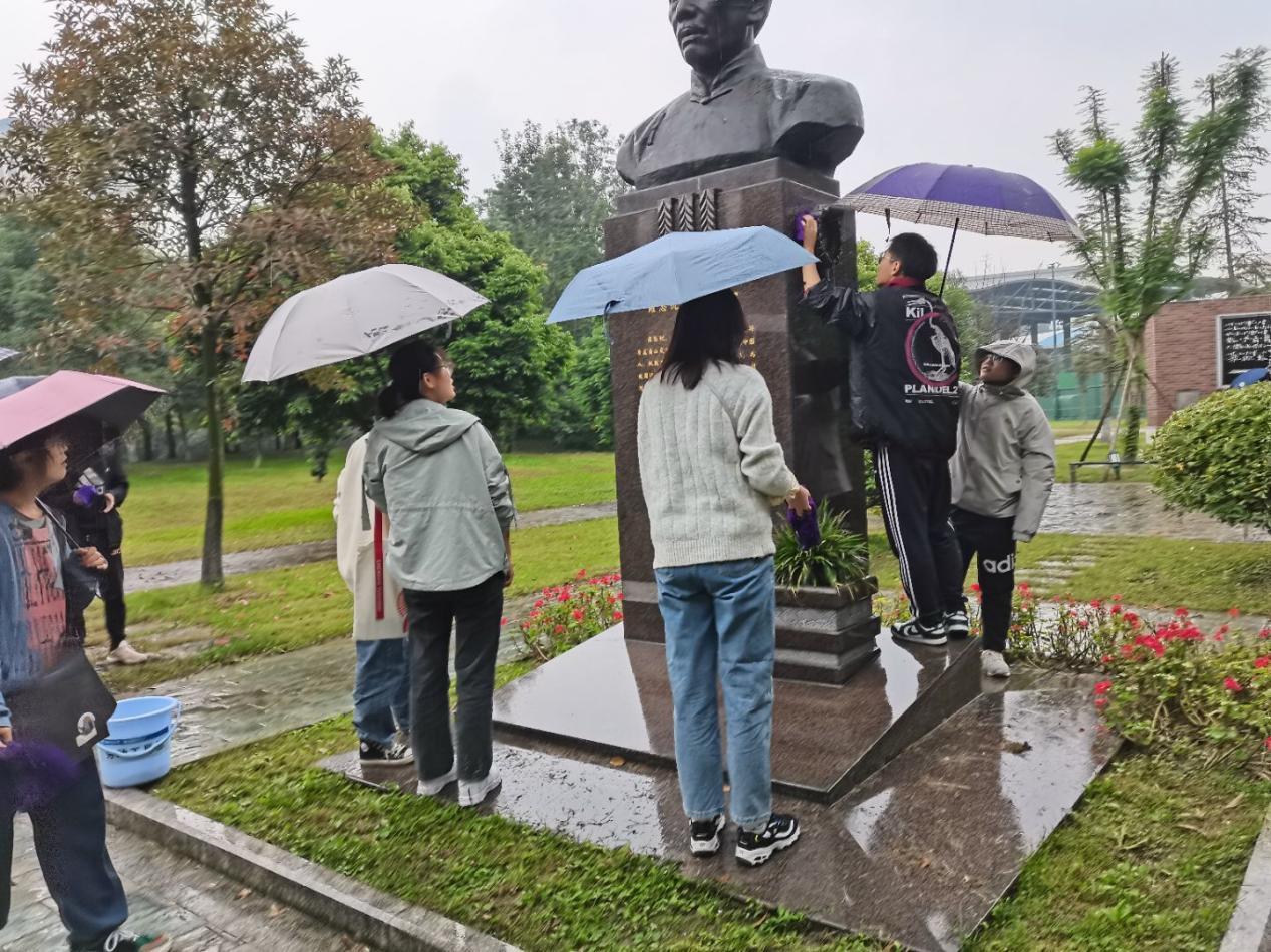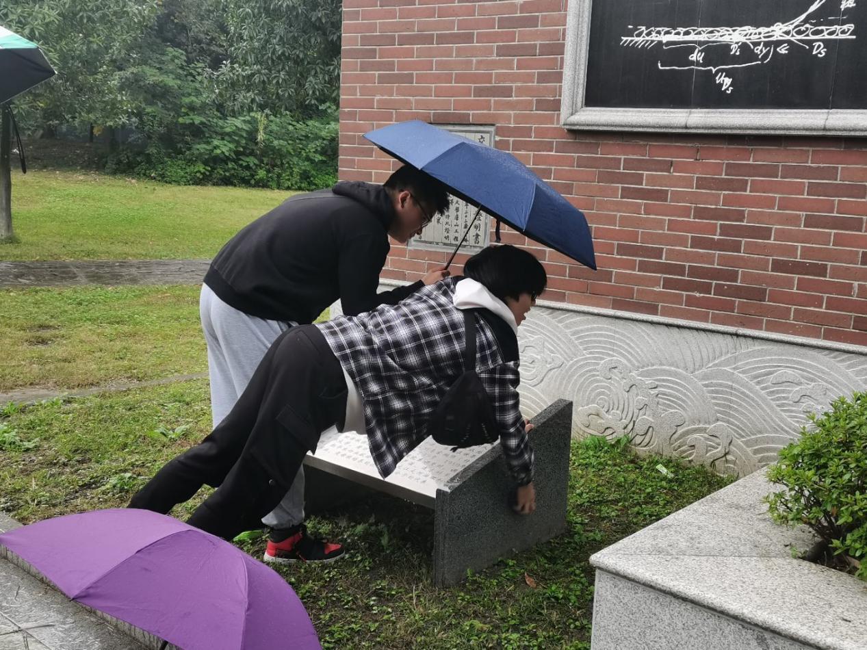 由于活动当天有一定的降水,所以同学们两两合作,一人撑伞一人对雕像进行擦拭,就算是有雨点掉落在脸上,打湿在衣服上,也没有一丝一毫的怨念,因为比起前人筚路蓝缕在科研道路上的摸爬滚打,这点小风小雨根本不算什么。正是因为有前人的不断探索,前赴后继的投入到报国事业中,我们的国家才变得越来越好,人民也才能安居乐业,我们也才能接受到良好的教育,所以我们才要自发的维护清理这些伟人先驱的雕像。我们清洗的不仅仅是雕像我们也在清洗自己的浮躁与内心的迷茫,我们在清洗的过程中通过对詹天佑先生,黄万里先生,罗忠忱先生事迹的回顾与进一步了解,从而了解坚定自己的梦想和信念。