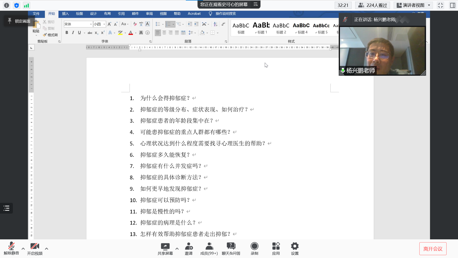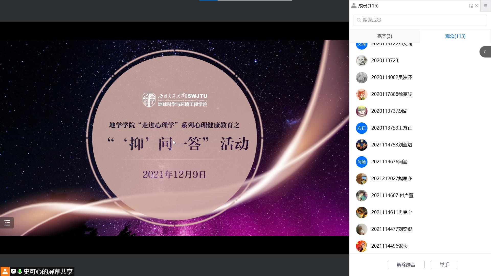 为进一步帮助同学们树立正确的心理健康观念,以积极心态应对负面情绪,增强员工关注心理健康的意识、普及心理健康知识,BEATS于12月9日下午16:00,采用线上腾讯会议的形式,组织开展了“走进心理学”系列心理健康教育之“‘抑’问一答”活动。本次活动由心理研究与咨询中心的杨兴鹏老师主讲。