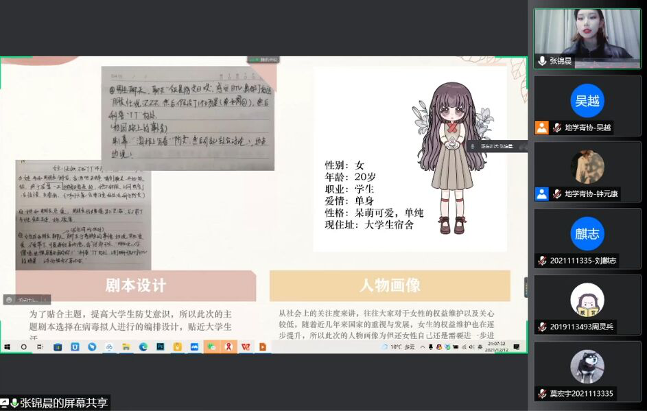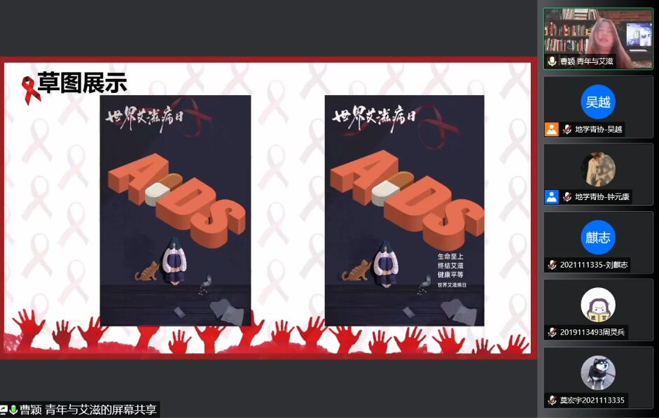 决赛于12月12日线上举行,答辩前,地学青协指导老师罗然老师对本次大赛进行精彩致辞。在答辩过程中,各位参赛选手用精彩的发言为我们展现了其作品的创作思路、制作过程等,呼吁大家做到“生命至上,终结艾滋,健康平等”。答辩结束后,员工园区自我管理委员会指导老师刘颖老师对本次比赛进行了精彩深刻的总结。决赛最后,由工作人员统计评委们公正客观的评分,评选出优秀作品共11项。