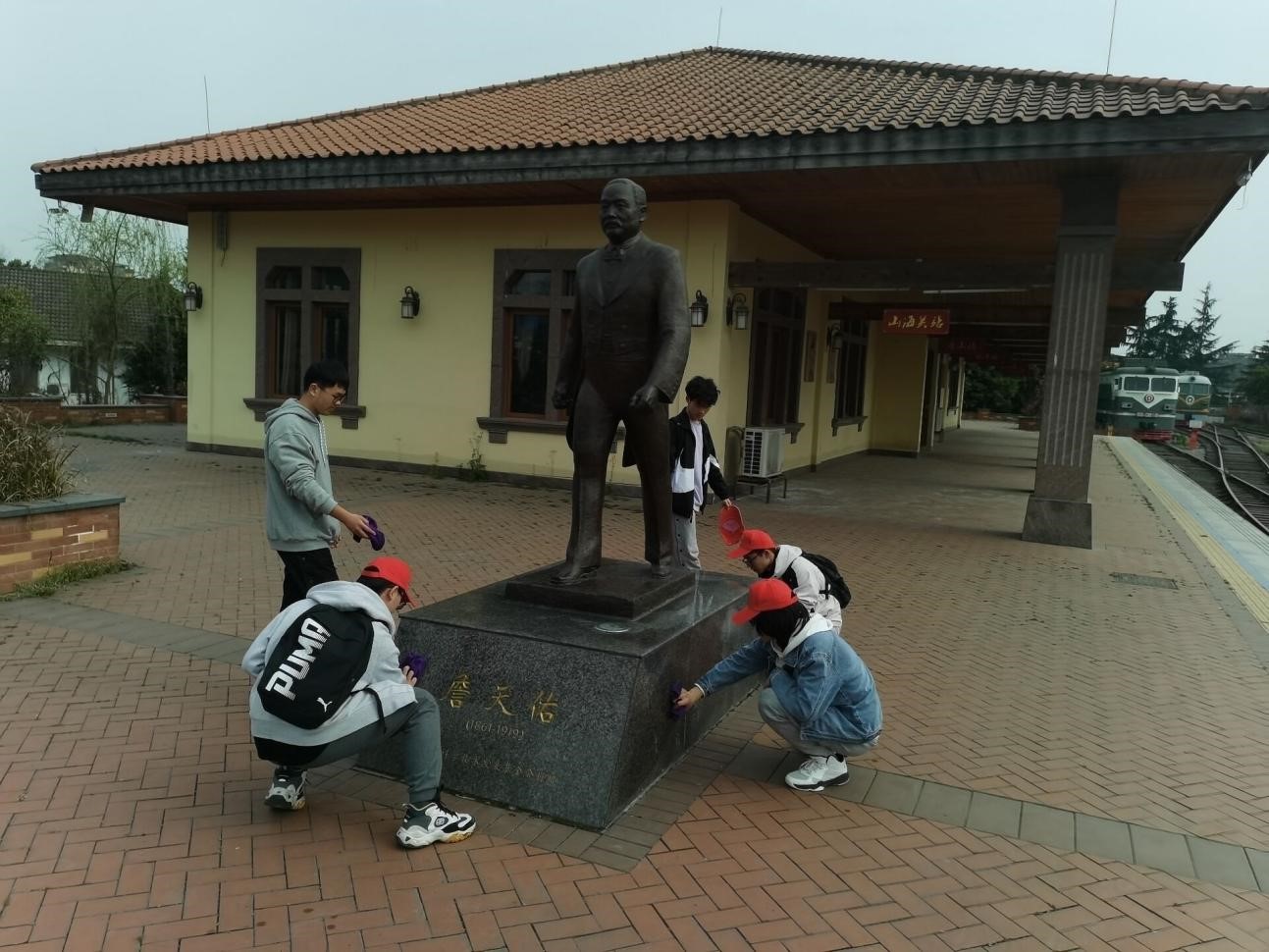 同学们仔细擦拭詹天佑先生的雕像