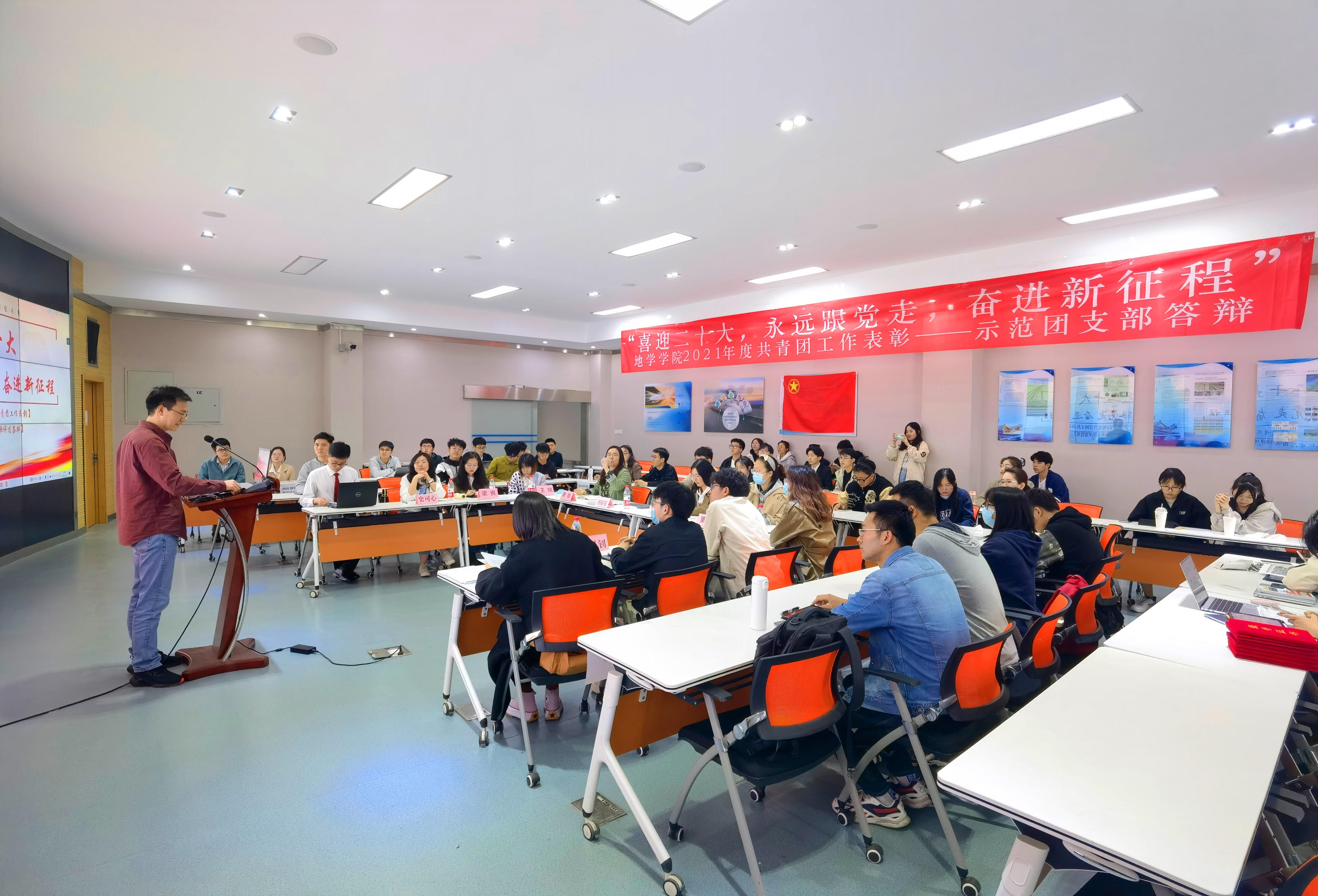 在主持人李宝贤介绍了本次答辩会的各位评委和评选规则后,答辩正式开始。首先进行答辩的是2019级地质第一团支部的代表黎河川,他介绍了支部的整体概况与特色建设,作为第一位答辩代表,他的现场表现得到师生的认可。
