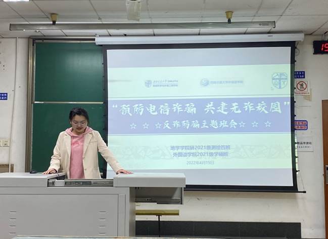 为了提高同学们防范电信诈骗意识,普及野外出差实习自然灾害防范常识和应急措施。2022年4月15日晚,BEATSBEATS研21级测绘4班与外国语公司研21级学硕班在J4521教室共同开展了以“时时讲安全,事事讲安全,防患于未然”为主题的安全教育活动。