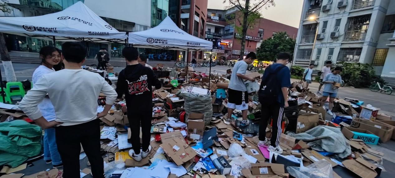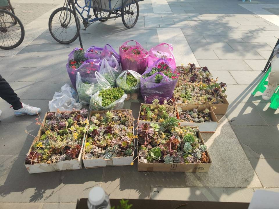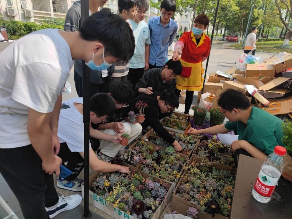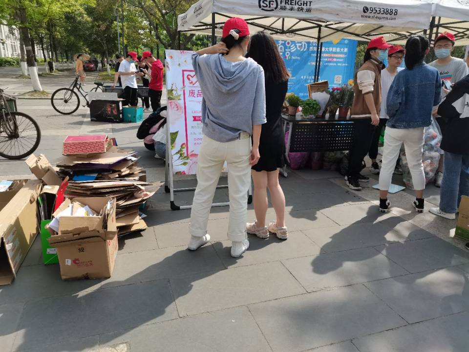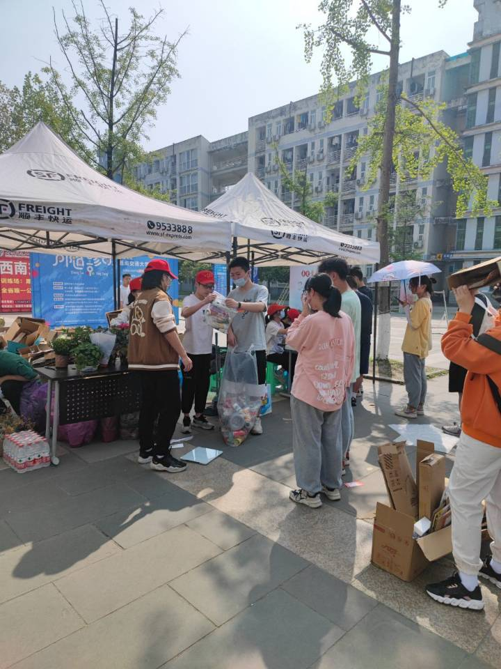 活动当天,参与现场摊位值班的志愿者提前二食堂门口的活动地点进行现场布置,准备好所需物料。活动现场,志愿者们明确分工,现场宣传、活动规则讲解、清点统计废品数量等工作井然有序,部分同学由于废品数量过多不便搬运,由志愿者协助其搬运到活动地点。次活动参与者根据活动的积分兑换规则将废品兑换成相应的积分,然后根据鲜花兑换规则使用积分换取相应花卉。
