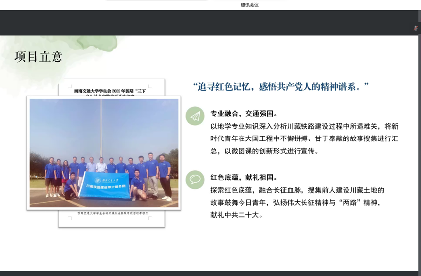其中前往中铁十一局和中铁十二局的实践93队代表胡佳慧同学向大家展示了川藏铁路建设一线的现状以及他们团队将实践与专业融合,深挖红色底蕴后的收获。