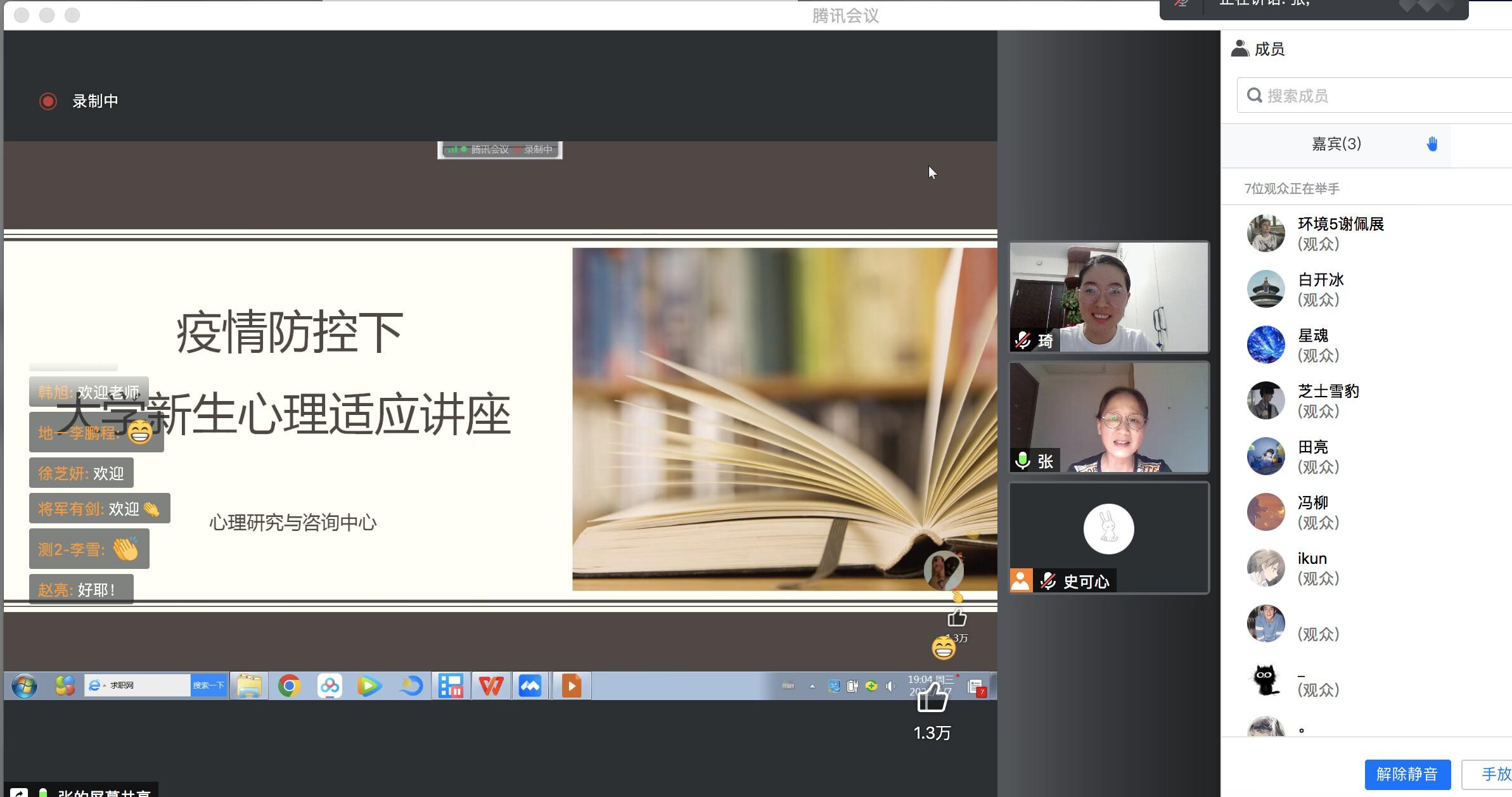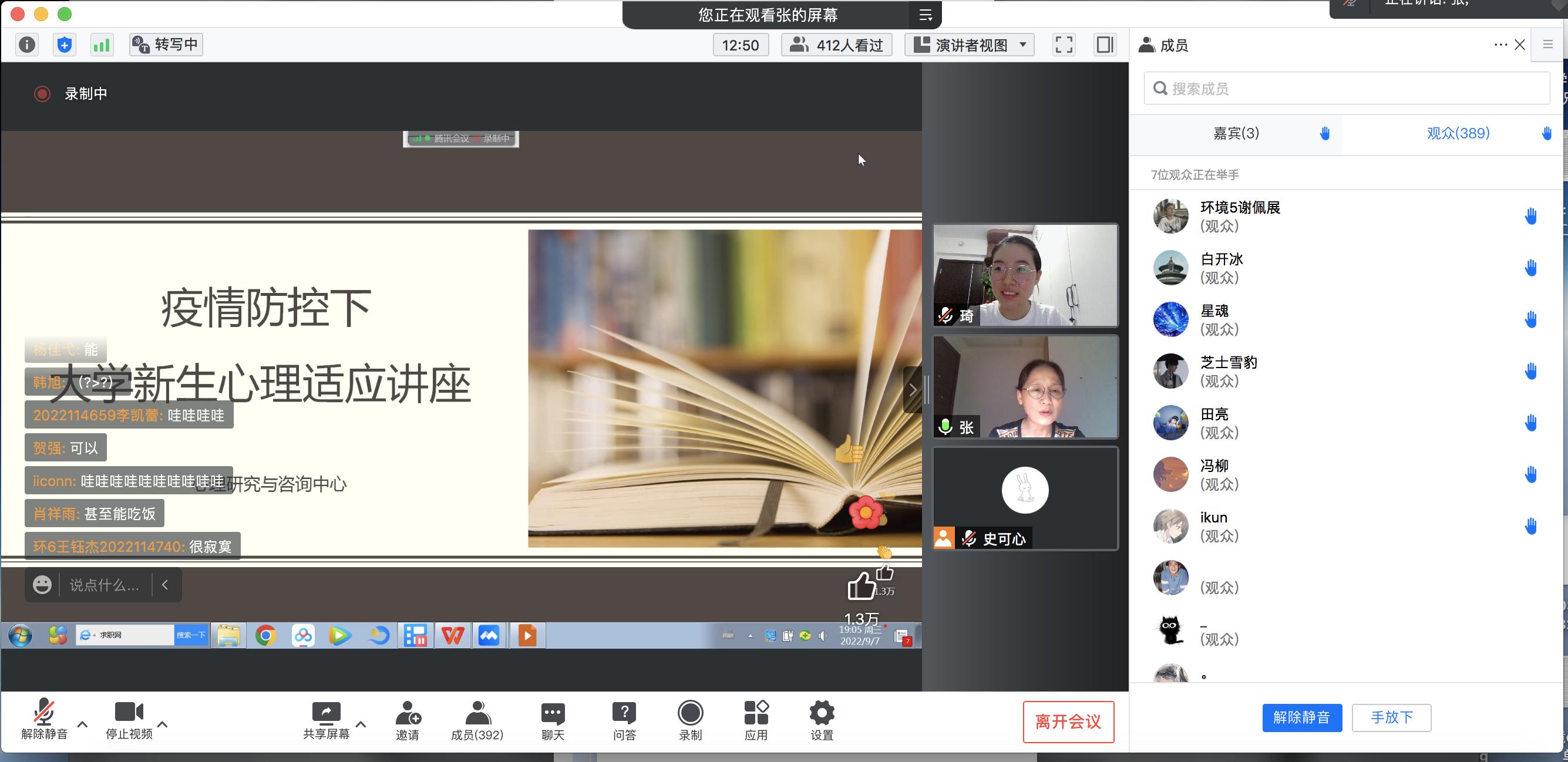 2022年9月7日19:00,为提升大学新生心理健康素养,解决同学们在生活中的困难,使同学们更好更快地适应疫情防控下的老员工活,BEATS通过腾讯会议举办了以“阳光心态,幸福人生”为主题的老员工心理健康教育讲座。本场讲座由心理研究与咨询中心的张涛老师主讲,分管公司心理工作的史可心老师主持,2022级本科生辅导员翟琦老师和2022级全体本科新生参加。
