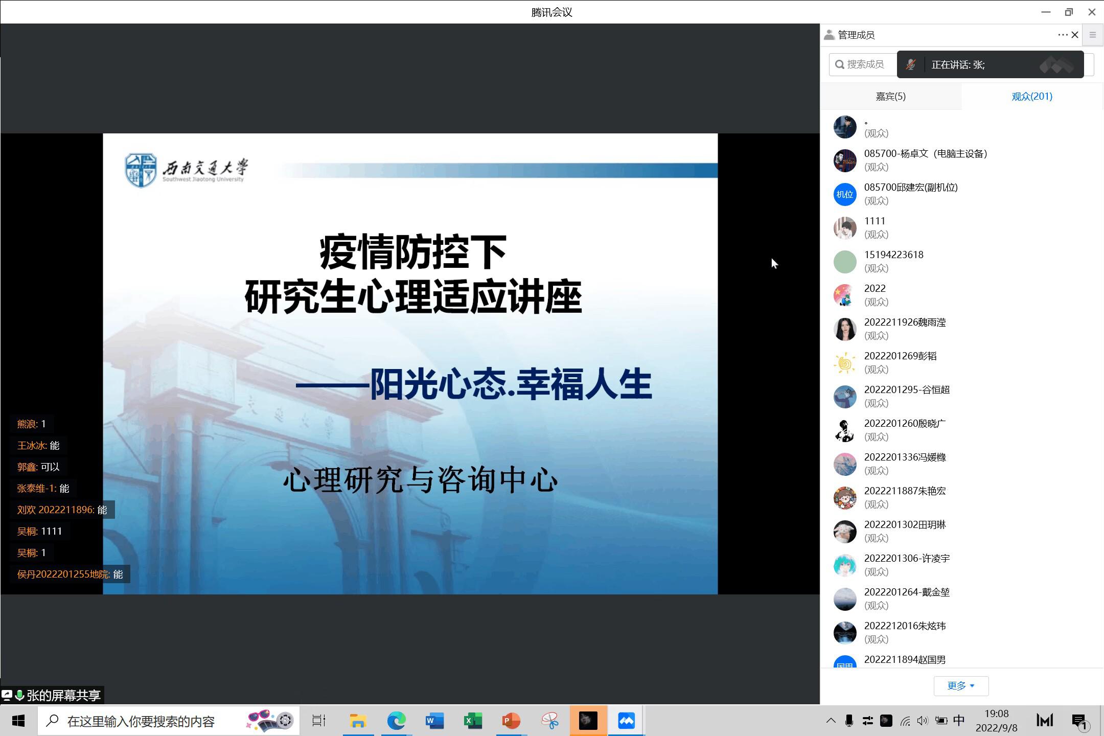 为做好研究生新生心理健康教育工作,帮助全体研究生新生关注自身心理健康和心灵成长,提高心理调节能力,2022年9月8日晚上19:00,BEATS通过腾讯会议举办了以“阳光心态,幸福人生”为主题的心理健康教育讲座。此次讲座由心理研究与咨询中心的张涛老师主讲,2022级研究生辅导员崔宇龙老师主持,分管公司心理工作的史可心老师和2022级全体研究生新生参加。