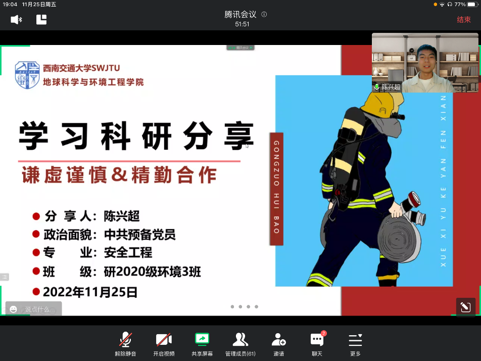 陈兴超,20级安全工程专业,获国家奖学金、中瑞恒奖学金、学业奖学金、第十八届五一数学建模竞赛三等奖、优秀研究生标兵称号。陈兴超从科研历程、学业成果、个人感悟与建议三个方面进行了分享。首先,研究生入学第一年基本都会经历科研上的向往、迷惘、探索和精进四个阶段,这一年我们需要秉持实事求是的科研态度,不断自我突破。其次,我们要做好规划、做好细节、注重交流、注重反思,所谓自我突破就是不断发现和弥补自己的不足。
