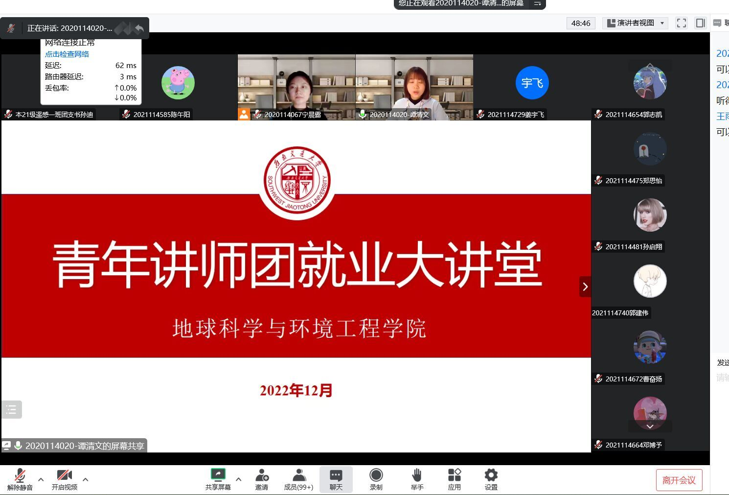 奋进新征程,建功新时代。11月-12月,青年讲师团采用线上线下相结合的方式,全覆盖在全院团支部开展就业宣讲活动。从“什么是职业生涯”引入话题,强调生涯规划对自我成长、发展的重要性;接着从知己、知彼、决策、行动四个方面介绍如何进行职业生涯规划。第一步是自我剖析,性格特征和价值观是相对比较稳定的部分,兴趣爱好和能力特长则是可以变化培养的,通过对自己的全面深入了解,才能找到适合自己的生涯发展道路;第二步是外部探索,通过列举很多同学进入大学或进入职场后的强烈落差,说明对外部信息了解的重要性;第三步是在对自我和外界有了充分认知后进行决策,并设定目标;第四步是开展行动,并不断进行修正;最后,结合公司专业,讲述一些典型案例,帮助同学们更好理解就业工作,树立正确的择业观。