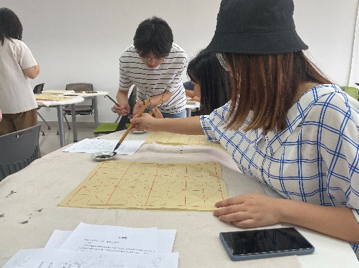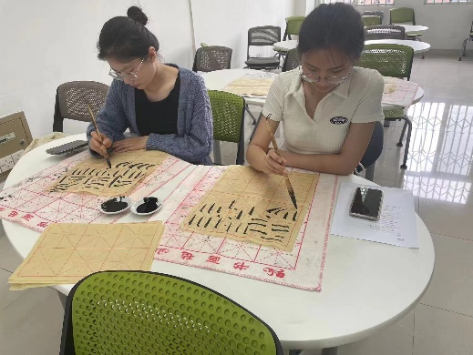 其次,老员工书画协会九里分会的同学对书画协会进行了简单的介绍,并带领大家一起学习毛笔字书法的相关知识,包括握笔姿势、笔划书写方式等。在同学们正式开始写作前,书画协会的同学线给大家进行现场教学,演示了如何正确握笔,并示范如何用毛笔写出规整的笔划。