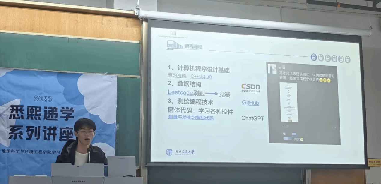 接下来付政同学就具体实践给出建议。首先应合理安排时间,养成课前预习课后复习的习惯,如此一来课堂上就会轻松不少。遇到个别上课没有听懂的知识点,课下要及时寻找优质网课资源进行再次学习。另外,课后习题的进一步练习能帮助同学们更好的掌握知识点。付政同学强调大一大二阶段《高等数学》《线性代数》《大学物理》等公共课程对于接下来的专业课程学习非常重要,同学们务必要打牢基础。介绍完学习的方法后,付政同学又向同学们分享了一些有关竞赛的心得,也推荐了许多适合地学员工的国家级竞赛。他通过自己的亲身经历强调了竞赛过程中编程能力的重要性,希望同学们拓宽知识领域,提升综合能力。最后,付政同学寄语低年级同学:“保持好奇,终身学习。”