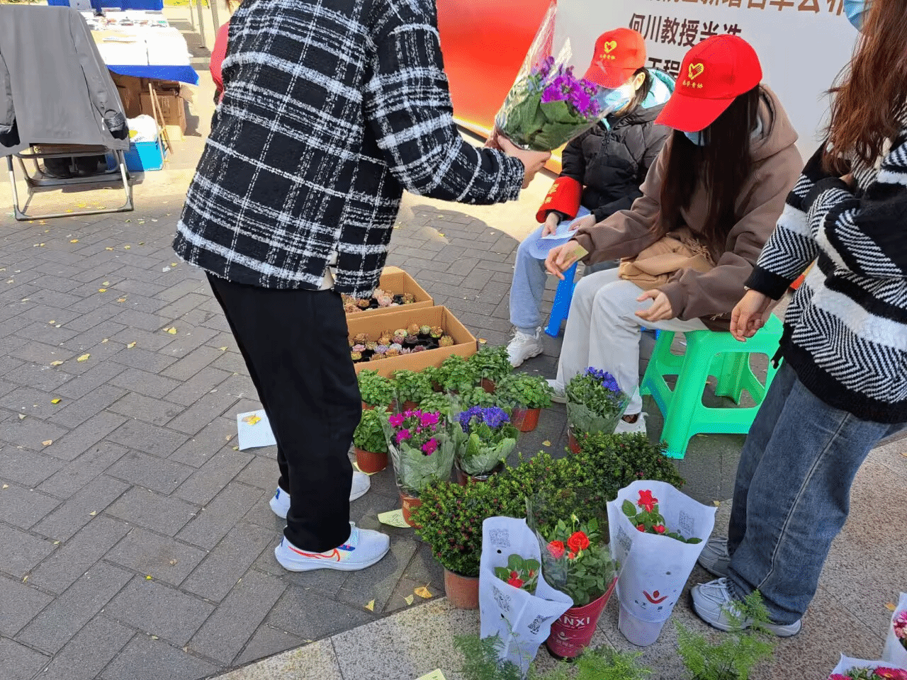 周六周日志愿者们于八点半到达活动地点布置场地,在九点半活动正式开始。志愿者们一天分四次值班,活动时间从上午九点半持续到晚上六点,每组值班三小时左右。当志愿者们将精心挑选的鲜花摆放整齐,贴好标签,一切准备就绪后,许多提前了解的同学渐渐过来参与活动,同时吸引了不少同学前来询问与兑换鲜花,而志愿者们则针对问题耐心、细致地做出解答。在同学们提交废品后,志愿者们面带笑容地进行称重搬运废品、记录废品兑换的分数,同学们于登记处回答有关环保问题最后换取自己心仪的鲜花。还有不少志愿者骑三轮车前往员工宿舍,帮助废品较多的同学搬运废品前往活动场地进行现场称重和积分兑换,整个活动现场热闹而有序。