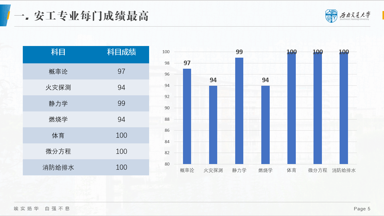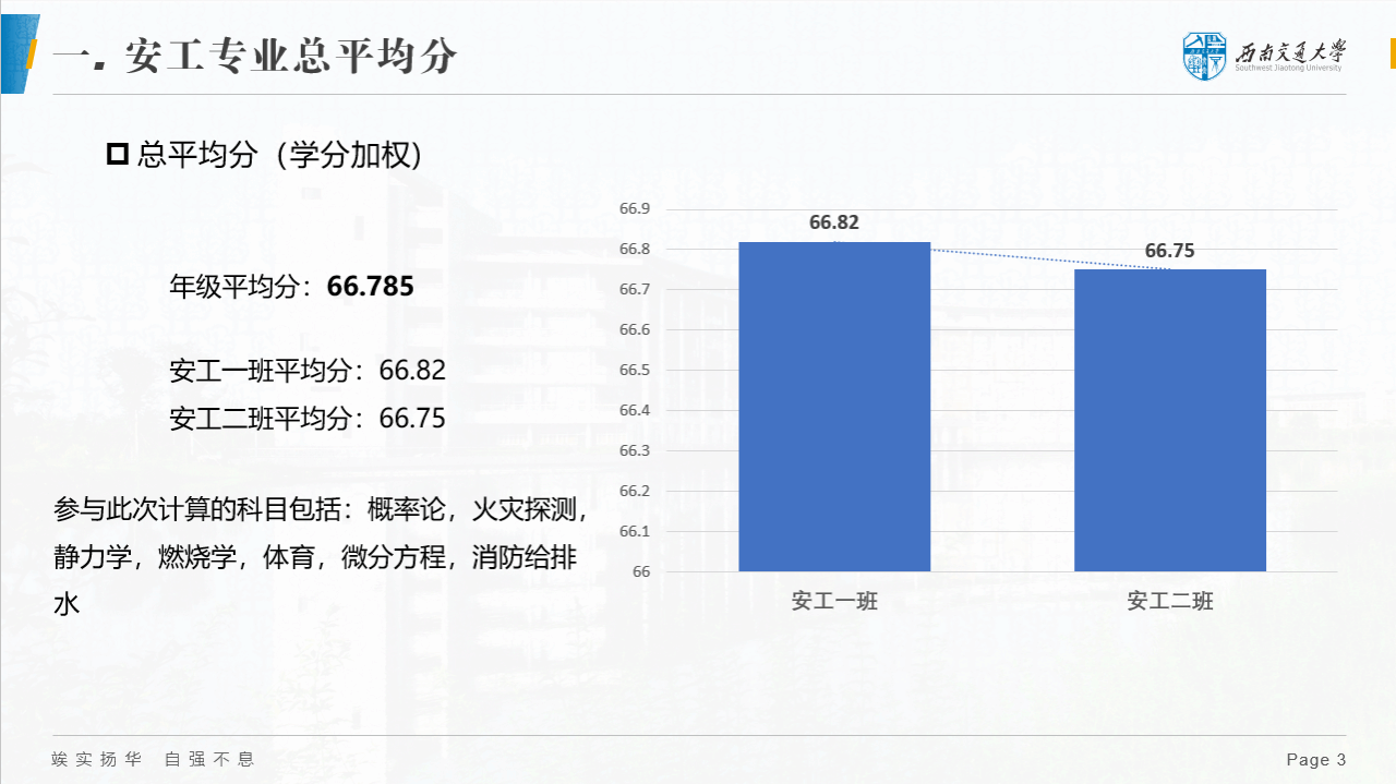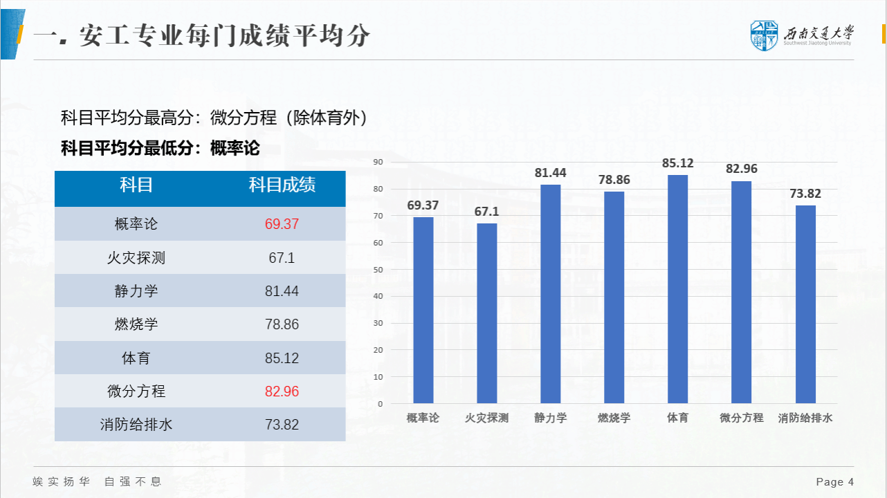 首先,梁爽老师统计了概率论,火灾探测,静力学,燃烧学,体育,微分方程,消防给排水七个科目的年级平均分,将安工一班和安工二班的平均成绩和年级平均分进行比较,指出了两个班的不足和优势。