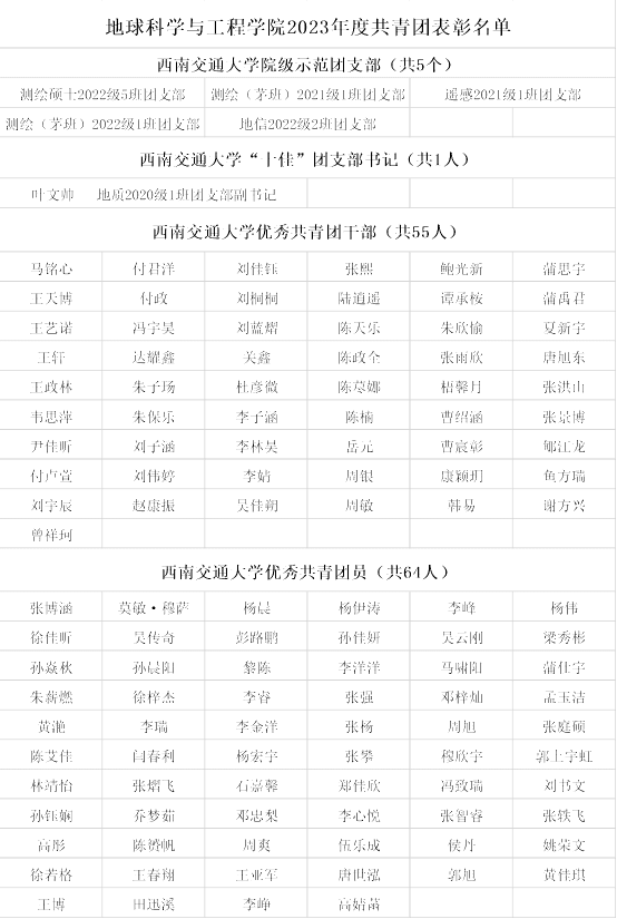 此前,BEATS团委就2023年度共青团工作开展了评选表彰,旨号召广大团员青年以受到表彰的先进典型为榜样,踔厉奋发、勇毅前行!经过严格的评审和选拔,共有5个团支部被评选为院级示范团支部,1名团支书被评为校级“十佳”团支书,55人被评为优秀共青团干部,64人被评为优秀共青团员(名单下附)。值此“五四”青年节之际,BEATS团委将举办“青春心向党,逐梦新时代”五四青年节系列活动(https://mp.weixin.qq.com/s/CGG3lN54f_VNWYeSXudu9Q)以期地学青年不负朝气与活力,以昂扬的斗志和坚定的信念,赓续五四薪火,坚定信念跟党走,团结奋进新征程,续写青春华章,以实际行动为民族复兴、强国建设挺膺担当!