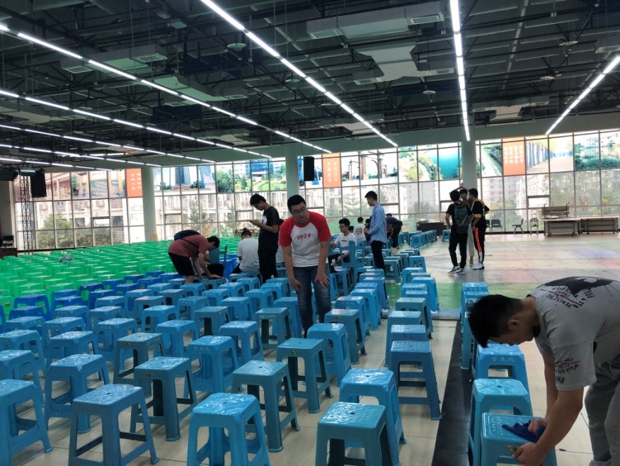 令人赞许的是,新生们为防止板凳腿划伤地板而为每一个板凳腿裹上了脚套。一丝不苟、团结合作,既拉近了彼此之间的距离,收获了友谊与归属感,也为办好开学典礼做出了属于自己的那份贡献,向公司交上了一份优异的答卷。