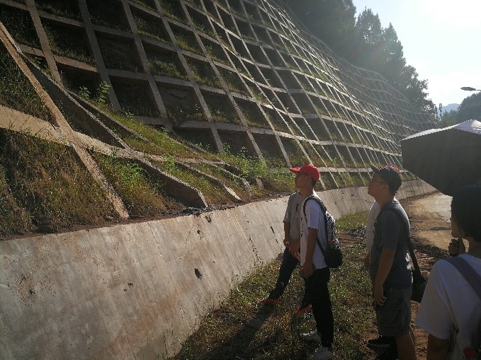 8月15日上午,实践队前往长滩河进行水质监测,队员们从河流下游至上游选取了7个水质观测点并采样,利用pH试纸分别检测了其酸碱度,并对比了浑浊度。下午,队员们走访自然资源管理局,向地质相关工作者沈老师请教了昭化区今年来的地质灾害发生情况及对应处理措施,随后沈老师带领队员们前往附近的一处边坡治理点,介绍了格沟混凝土护坡的边坡处理办法。