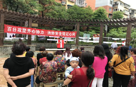 上午九点,大部分居民群众都已到达会场,他们聚在一起,拉着家常,一派和谐温馨的景象。他们唤着自己的团队成员一同拍照,一个个笑脸映在摄像头里,四周的绿化映衬着他们的身影,格外养眼、舒服。顺江人民的和睦气氛,奠定了消防宣传活动完美完成的基础,顺江的优秀管理与凝聚力,是全四川省乃至全国社区的建设榜样。