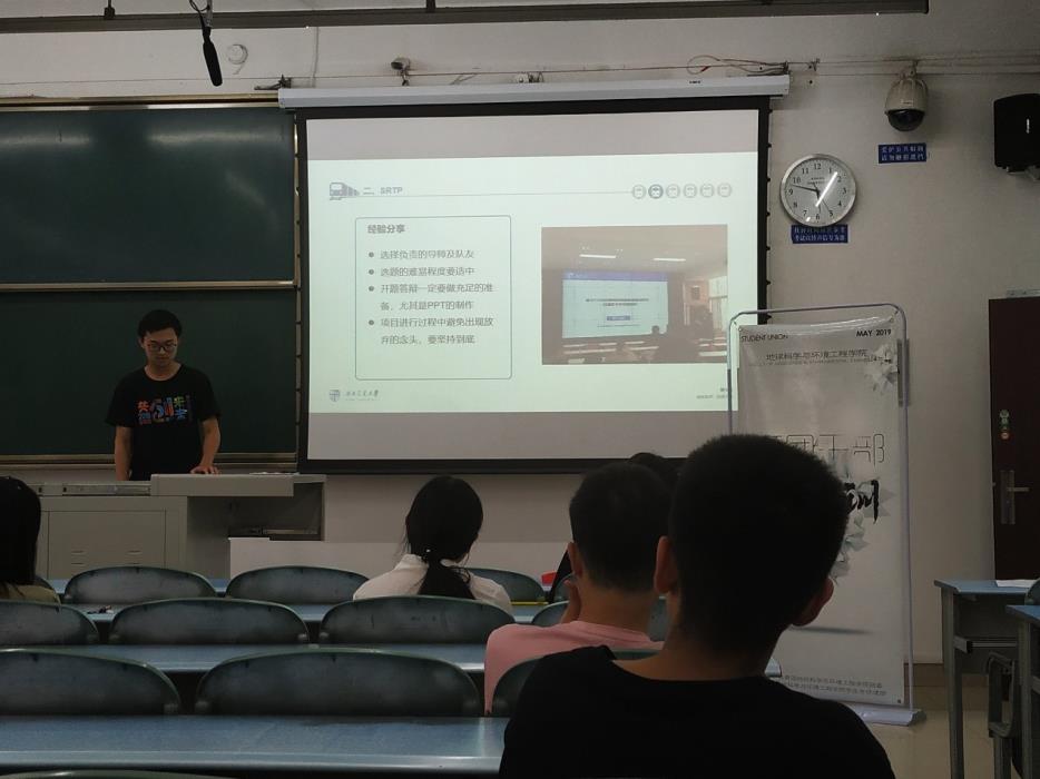 科创部部长黄贤喆为同学们就科创竞赛活动对大家进行了培训。黄部长主要从科创竞赛、SRTP项目、科创的必要性、经验与建议四个角度进行讲解。首先他提到了各项热门比赛,做比赛不仅仅能够获得保研加分,更能够起到锻炼自己,提升自己,促进与人合作的作用。接着,他为我们介绍了一下SRTP相关事项以及如何做才能完成一个比较好的项目。文体委员在科创活动进行之中起着非常大的作用。文体委员需要搜集相关信息,编写科创通告来动员大家投入科创竞赛活动。此外,文体委员个人的影响也非常重要,要身体力行,带动更多同学的参与。另外,文体委员还需要具有先机,更早更全面地了解科创比赛的安排,做到更详细的规划。最后,黄部长又给宣传文体委员提了几点要求,要求他们经常关注校网和公司网,并及时把信息传递给全班同学。