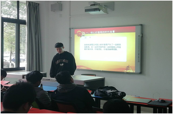 活动一开始,高涵科和同学们讲了社会主义核心价值观的形成过程,并再次讲述其基本内容:“富强,民主,文明,和谐,自由,平等,公正,法治,爱国,敬业,诚信,友善”,并分别就其具体内容展开了阐述。之后分别讲述了核心价值观的价值目标、价值准则、价值行为。同学们认真听讲并仔细思考。接着,高涵科和同学们讲了核心价值观的鲜明特点:民族性,普遍性,崇高性。并讲述了核心价值观的重要意义,最后就核心价值观的积极践行等方面做了详细的说明。