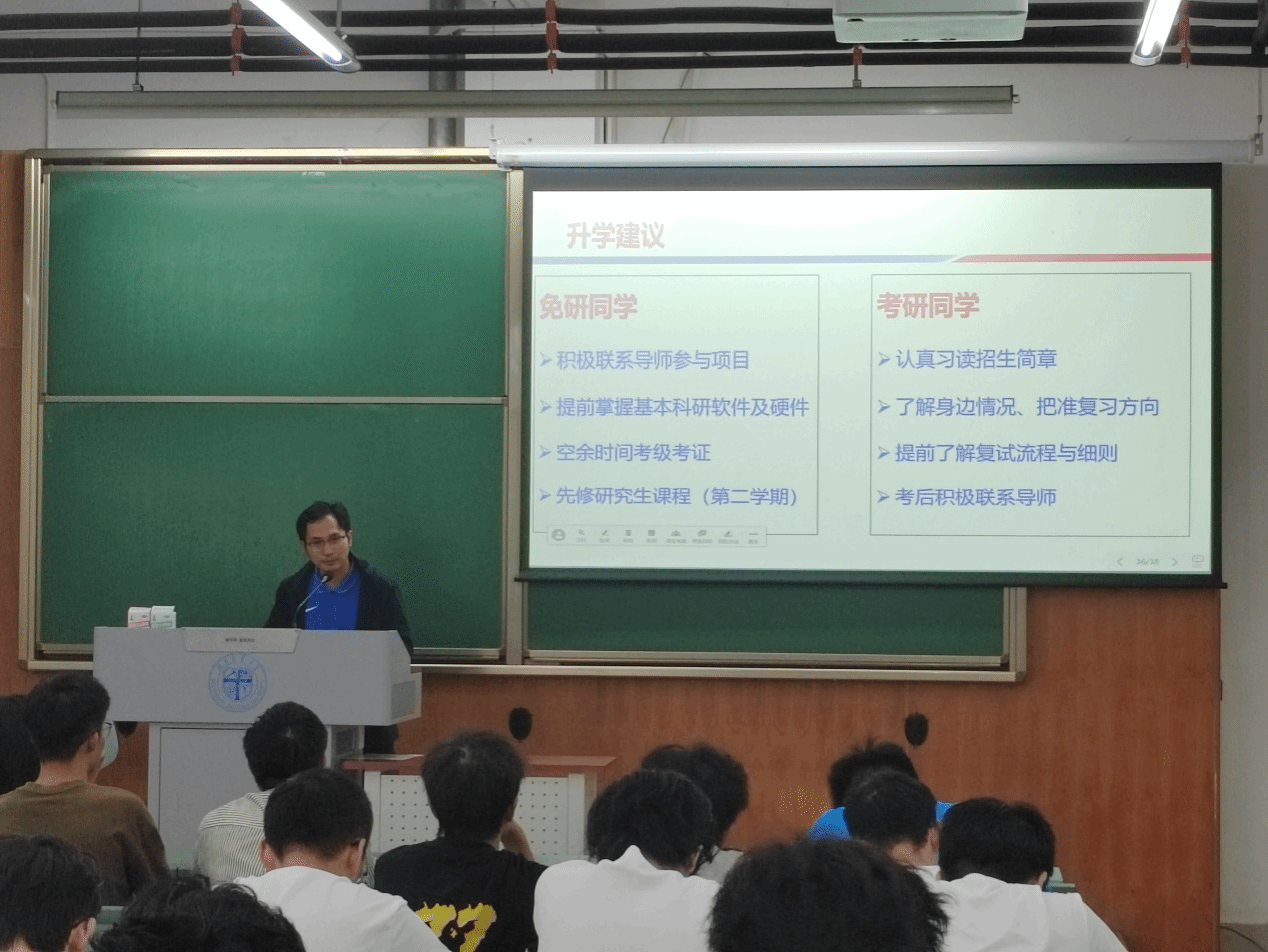 交流会现场,廖昕老师首先围绕学科介绍、专业建设、团队概况、研究方向等向同学们介绍了地质系概况,同时介绍了创新型人才国际合作培养项目,解答了专硕和学硕的区别,解读了公司研究生招生简章。