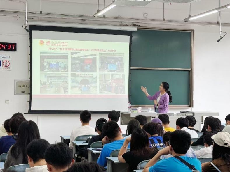 团课伊始,韩沁儒老师以“硬联通、软联通、心相通”为主线,系统梳理了公司在实践育人方面的丰硕成果。在“硬联通”方面,聚焦川藏铁路博士建设服务团:五年间,团队暑期扎根沿线工程段,开展地质勘察与技术调研,以实际行动服务国家重大工程,彰显“交通强国”使命担当。“软联通”部分,韩老师分享了“红石榴训练营”通过文化沙龙和专题研学强化中华民族共同体意识的经验,并展示了优秀员工访谈成果,为同学们的成长路径提供有益参考。“心相通”环节,则通过介绍团学组织深入社区开展课业辅导、走进乡村助力农业发展的志愿服务案例,呈现青年学子与社会的深度融合,树立了社会化能力培养的生动典范。