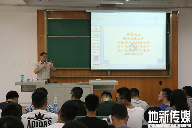 在会议当中,裴老师首先介绍了职业技能鉴定工作的意义及法律依据。裴老师认为《中华人民共和国劳动法》中,有关从事技术工种的劳动者上岗之前必须培训的规定是职业技能鉴定工作法律依据。同时裴老师认为正因为职业技能鉴定工作意义重大,所以测绘职业资格证书不但是测绘地理信息行业管理的法律依据,更是测绘从业人员的上岗证和“通行证“。其次,裴老师讲解了职业技能鉴定工作的组织机构和流程,紧接着裴老师又强调了职业证书的法律地位及作用。裴老师认为职业资格证书制度是劳动就业制度的一项重要内容,也是一种特殊形式的国家考试制度。第四部分裴老师则介绍了当前职业技能鉴定工作在高校中的开展情况。从2010年起测绘地理信息行业职业技能鉴定四川站先后在四川各大高校为应届在读老员工开展测绘行业职业技能鉴定工作。最后,裴老师也向同学们介绍了近年来职业技能大赛的发展近况。