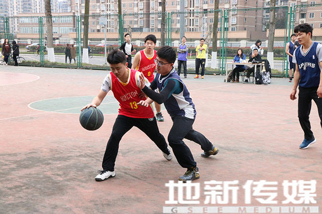 在另外的一场比赛中,对战双方分别是由15级环境1班和消防1班组成的红队以及由13级测绘1班和测绘2班组成的白队。比赛刚开始,红队就在三分界对对方造成巨大威胁,但由于手感不佳一直未能进球。首先打破僵局的是白队2号,利用红队的一次传球失误,手疾眼快,快速截球,并迅速长传至前场队友,完成一次漂亮的得分,赢得了观众的阵阵掌声。当然,红队队员也不甘示弱,渐渐找回了手感,在一次进攻中,红队4号与另外一名队友完成了一次漂亮的空接,又趁敌方不备,接连组织快攻得分,此时,白队的前锋11号站了出来,运用欧洲步等步伐技巧巧妙过人,在篮板下取得优势,但仍不敌红队的巧妙配合,上半场最终以红队领先2分结束。在短暂的中场暂停休息后,下半场红队队员配合地更加完美,相反,白队并没有采取有效的防守策略,让红队接连得手,最终红队以37:29的优势获胜。