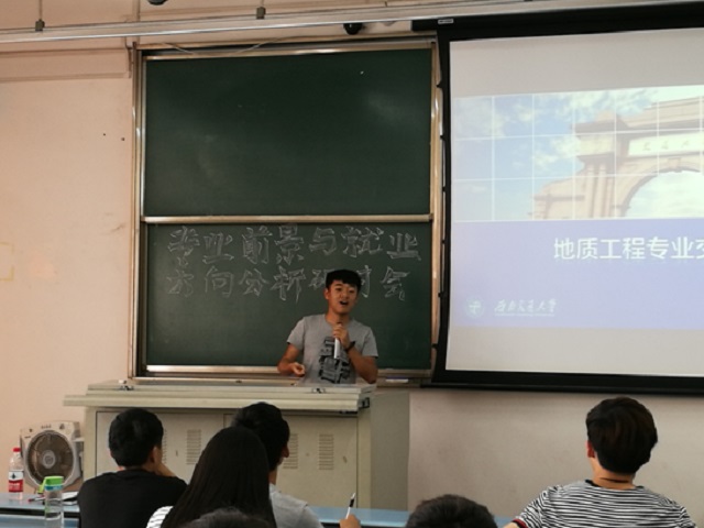 首先是测绘2013级的研究生学姐屈亚,她开门见山地指出了测绘专业本科就业的传统形式,并针对当前形势提出了自己的见解。建议同学们在校期间,应利用好现有的平台与资源充实完善自己,多参加各级竞赛、丰富自己的工作实习经验,早点做好就业准备。随后是来自消防专业的王建宇学长,他将消防专业的应用、前景、毕业去向以及学习规划进行了详尽的介绍,另外王学长还特别引用11级至15级研究生就业率高达100%的数据,告诉同学们要对未来充满信心。最后是来自公司十大国家特色专业之一的地质工程的杨恬学长。杨恬学长指出,地质工程专业就业面广,本科生的就业主要面向铁路局、工程局、地质队和设计院;研究生主要就业于各类设计院,工作环境相对较好,女生也可以在事业单位,高校,房地产等环境工作。杨学长在学习方面的建议是注重基础学科、把握机会参加全国地质技能大赛,校“地质标本鉴定”大赛等比赛,增长见识,为以后的工作做好准备。