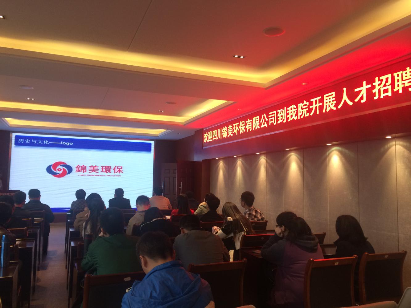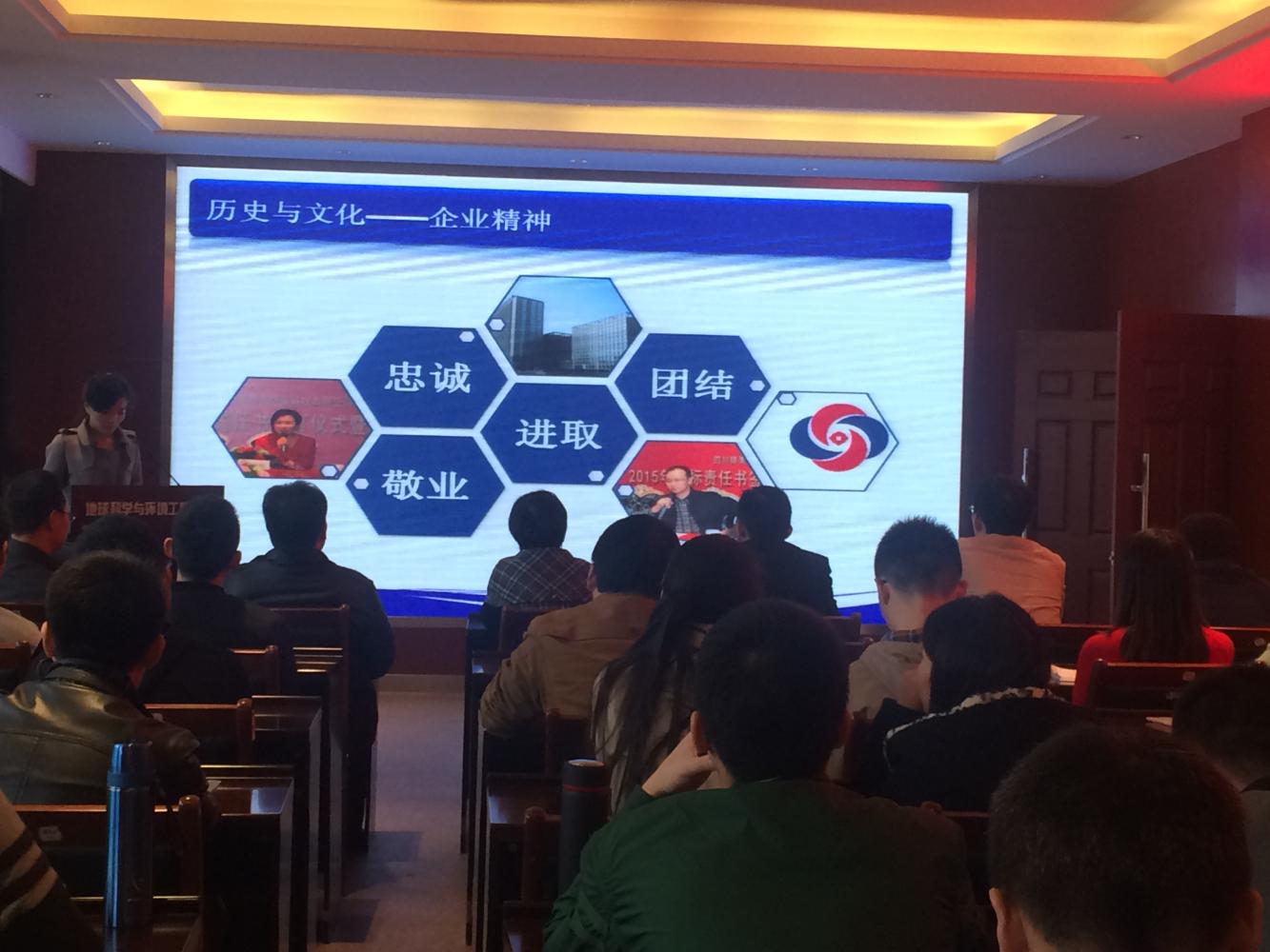 公司负责人先是以幻灯片形式介绍了企业概况,企业文化,发展历程等同学们十分关心的方面. 四川锦美环保(集团)科技有限公司成立于2011年,是专注于提供系统环境方案,解决环境综合问题的第三方综合性合同环境管理高新技术企业。主要致力于为企业、政府及相关事业单位提供第三方环境影响评价、环境监理、水土保持和环保可行性研究等环保技术咨询服务;第三方环境检测及检测运营服务;第三方水污染治理工程设计、施工、运营一体化服务。通过2年来本着“以人才为立足之本以创新为发展之源以诚信为生存之道”的不断努力获得环境质量认证证书(EMA)、质量计量认证证书(CMA)、国家级高新技术企业证书等荣誉。