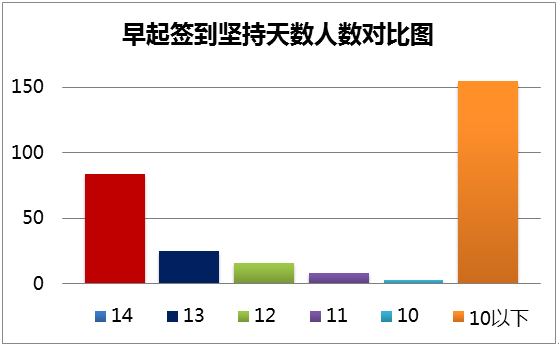 坚持每天(共14天)签到的同学有84人,签到13天的同学有25人,12天16人,11天8人,10天3人,10天以下155人。