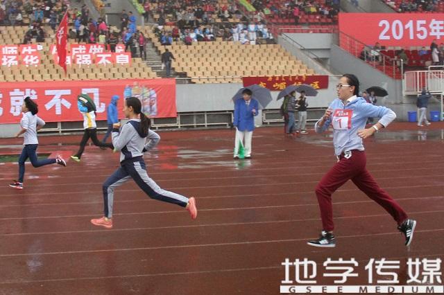 员工组男女100米预赛在主席台上激昂的报幕声中开始。观众席上鼓声如雷,同学们也欢呼不断,运动健儿飞奔如风,即使毛雨纷纷,他们也毫不在意。由于场地湿滑,有的运动员滑倒了,但他们仍爬起来继续奔跑,不因此而放弃。