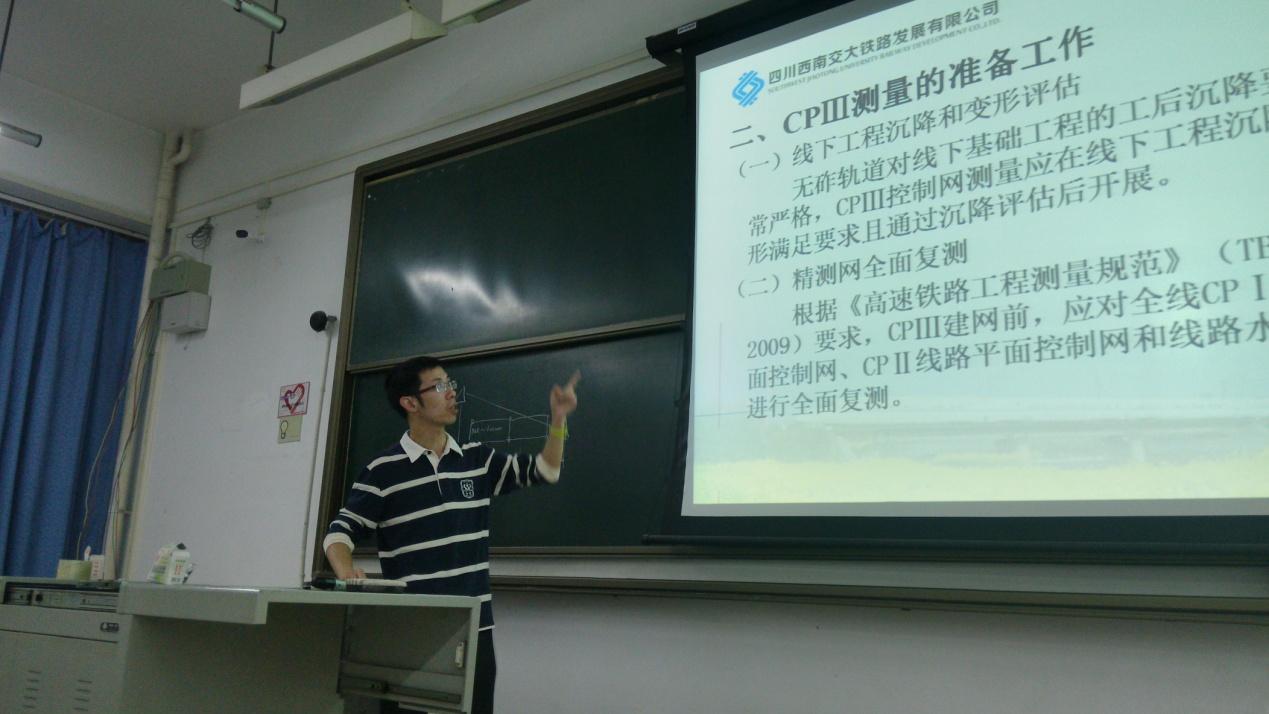 此次交流会目的在于让已经步入大三的同学们了解高速铁路精密控制测量体系、就业情况和未来的专业发展方向。为了更好地激励大家,龚志强对日后的专业方向,尤其是高速铁路方面,为大家做了全面系统的介绍,并以其丰富的十年工作经验,言简意赅地为同学们介绍了实际工程建设中,有关铁路控制网的分级布网原则,重点讲解了框架控制网(CP0)、基础平面控制网(CPI)、线路控制网(CPII)、基桩控制网(CPIII)。