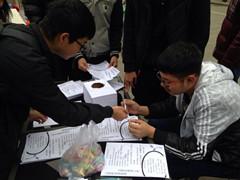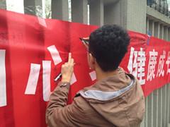 活动开始前,团支书将具体工作分配到各个同学手上,每位同学也都尽力做好自己的工作。十二时,活动正式开始,同学们被分为五组,其中两组同学在来往的人群中发传单,其余同学则坚守大本营,为到来的同学努力讲解并组织其有奖答题。到来的同学首先从箱子里抽取问题,回答正确的则得到小礼品,然后,再在横幅上签字。