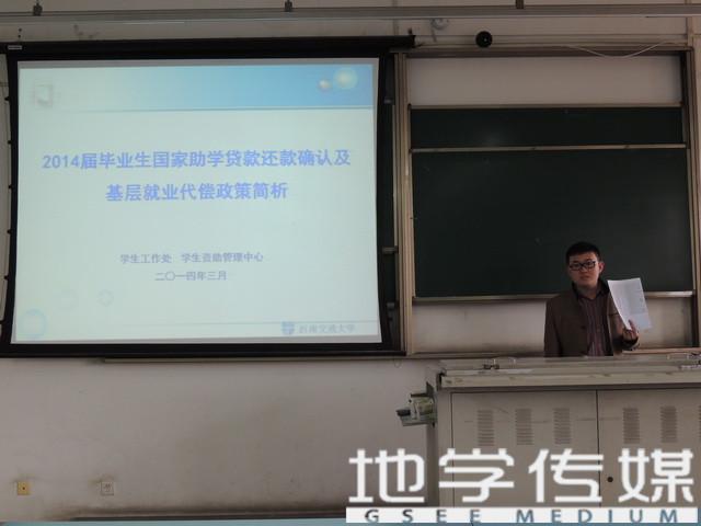 3月6日下午2点,2014届毕业生还贷动员会准时在2537教室举行。会议由辅导员闫剑老师主持,会议主要内容为“2014届毕业生国家助学贷款还款确认及基层就业代偿政策简析”,意在向广大申请了助学贷款的毕业生介绍还款及代偿方面的相关政策及注意事项。