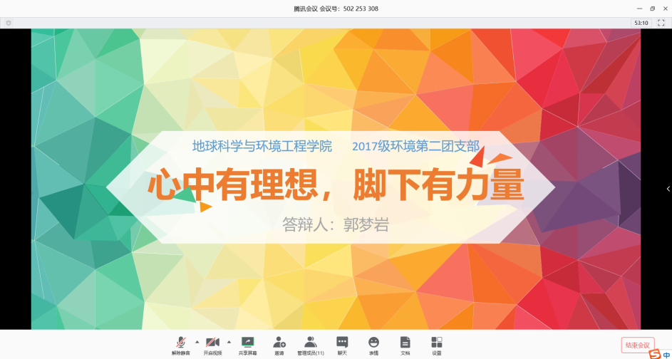 去年一年,公司众团支部与团委齐心协力,经过不懈努力,各项工作取得了良好的成绩。为了展现公司团支书的风采,并对优秀团支部进行评选和嘉奖。地学员工会团建部特于2020年4月3日晚19点在腾讯会议举办此次线上十佳团支部答辩会。本场答辩会的主持人为BEATS员工会团建部副部长万芳奕同学。BEATS团委书记周青老师、2018级辅导员孙惠敏老师、2018级辅导员杨都强老师和2017级辅导员李国欣老师担任评委出席此次活动。