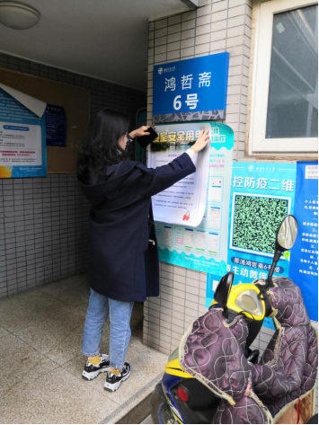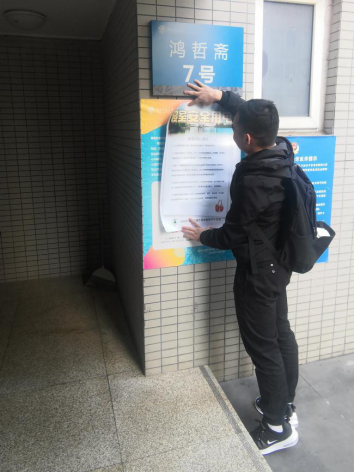 在寝室安全用电安全检查工作之中,研究生会委派了工作人员在鸿哲斋楼下张贴海报进行相关工作的宣传。