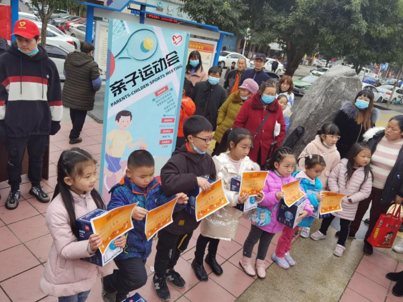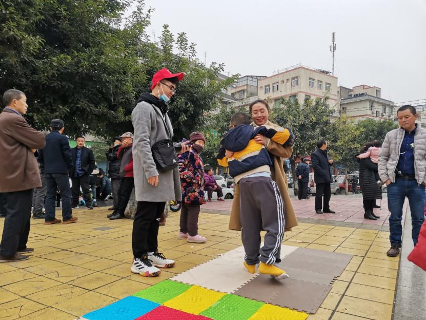10点整,林湾村主任发言宣布本次亲子运动会正式开幕,在跟着“体育委员”志愿者做好准备热身后,每组家庭都加入到游戏中。冬日的风虽然带着寒意,却吹不倒大家的热情,加油声、呐喊声、孩子的笑声让整个广场都洋溢着欢乐的气氛,在这样的鼓舞下,所有家庭都投入到游戏中。小志愿者们在各个游戏点主持游戏,维持秩序,调动大家的活动热情,为大家加油打气。