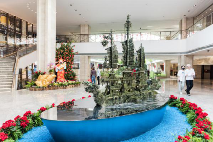 置于中堂的“故乡水”,以壁山、瀑布、小桥为元素,创造了一幅独具岭南风情的画卷,改革开放之初,白天鹅酒店接待的人员除了外宾,大多数是归国探亲访友的侨民,以“故乡水”赠游子,体现了当时的设计风格和时代背景。
