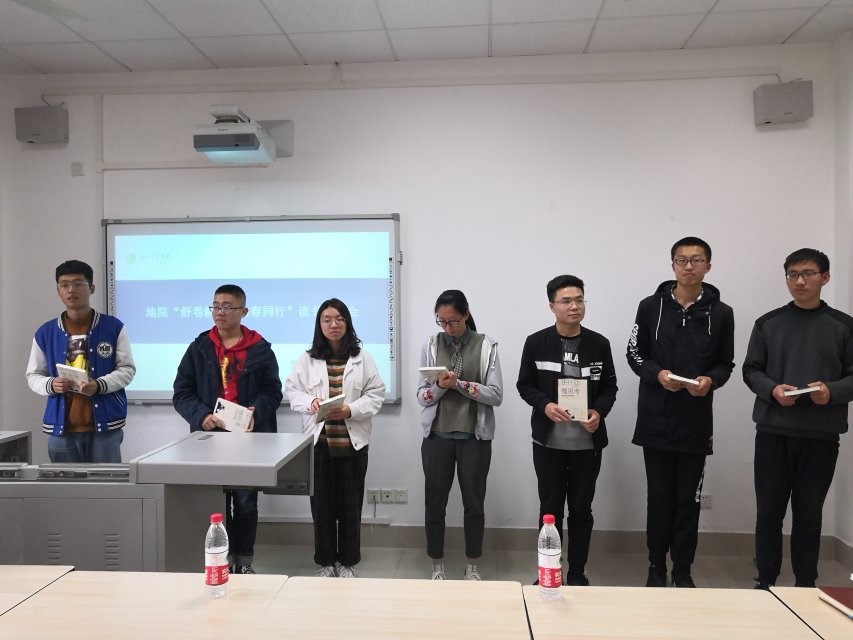 在本次活动中,分享人认真投入地向大家介绍了自己所喜欢的书目,讲述了自己与书的故事,分享了自己的读书心得及感悟,无论是杨子心同学对《苏东坡传》中东坡居士阔达胸襟的敬仰和对其生活的向往,张雪琪同学从《美丽新世界》这本书中悟出的人性的道理和对现实生活及未来的发问与感慨,钱琛同学和卜一凡同学两人对同一本书——《围城》的不同见解与思考,马少兵同学在《狼图腾》中所见证的狼的狼性,让我们感受到了动物有时比人类更加团结智慧的一面,何欢同学分享的《瓦尔登湖》作为20世纪最经典的反乌托邦文学之一,激发了同学们对那样一个“世外桃源”的好奇;亦或是陈俊凯同学分享《月亮和六便士》中那位放弃现有一切去追逐梦想的人,都能让我们感受到他们对所分享书籍的热爱,与此同时,也让我们拥有想去了解这些书目的一股奇妙力量。在自由交流与分享环节,老师同学们发表了自己的看法,老师引用“一千个人眼中就有一千个哈姆雷特”与同学说出了她眼中的《苏东坡传》,鼓励大家进行思想上的碰撞,同学们也各抒己见,说出了自己读书的感悟,与分享人交流讨论不同的见解。大家畅所欲言,各抒己见。最后,作为学风建设工作的指导老师,张恒老师对此次活动行了总结,抒发了对每位分享人所分享书目的个人领悟,并结合自身的经历,热切地表达了对大家的期望,同时也表示了对本次活动的认可。最后大家一起合影留念,记录下这充满书香的一次活动。至此,地院“舒卷耕读,与春同行”读书交流会圆满结束。这书香,将会伴我们走完一生。