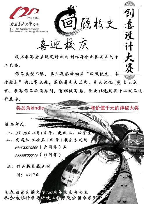 百廿载杲杲唐院垂宪中华育桃李,双甲子煌煌上庠薪火相传遍五洲。交大是千千万万交大人的家,是孕育许许多多祖国栋梁的摇篮,更是为实现中国梦做出重大贡献的地方。无论是辉煌的唐山时代,还是华丽的峨眉时代,抑或是现在两地三校区共同发展的时代,我们的交大都创造出不可磨灭的辉煌。这些辉煌将由我们去铭记,去传承。所以已经成功举办过多次“低碳环保创新生活”大赛的地BEATS即将举办一场“回顾校史,喜迎校庆”创意设计大赛。去铭记该属于我们的辉煌,去传承该属于我们的交大精神。作为交大人的我们,赶快行动起来,用手工作品的方式来展现你对交大的热爱吧。